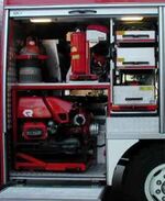 1 Tragkraftspritze TS 12 FOX mit Zubehör in tragbarer Lade: 2 Kupplungsschlüssel ABC, Saugerleinen, Überdruckventil, Sammelstück A-2B, Hydrantenschlüssel, Übergangsstück A-B, Reservekanister 5l,