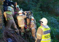 Übungsbefehl für Feuerwehr Kuchl und LZ Jadorf, Verkehrsunfall auf Zufahrt Georgenberg / Pkw abgestürzt / Personen eingeklemmt.