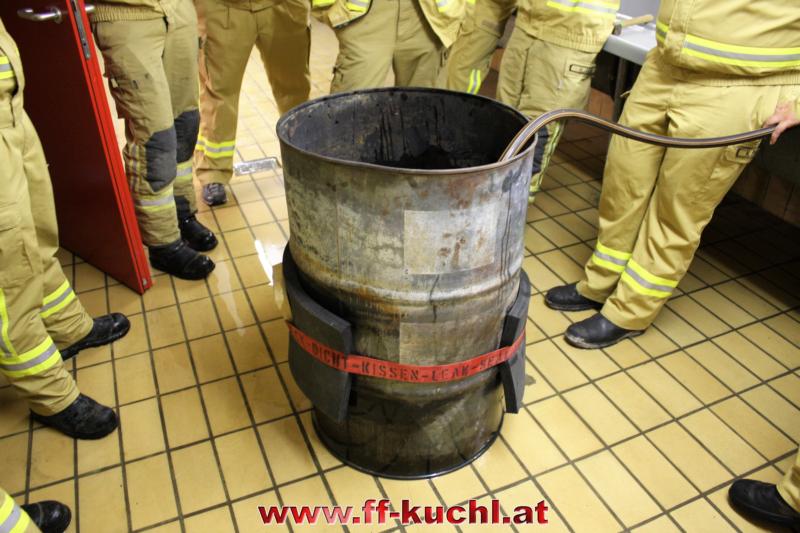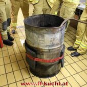 3. Station - HV Rupert Unterwurzacher: Gefahrenstoffaustritt aus einem Fass. Nach dem Kennenlernen der notwendigen Geräte und ihre Bedienung musste ein leckes Fass abgedichtet werden.