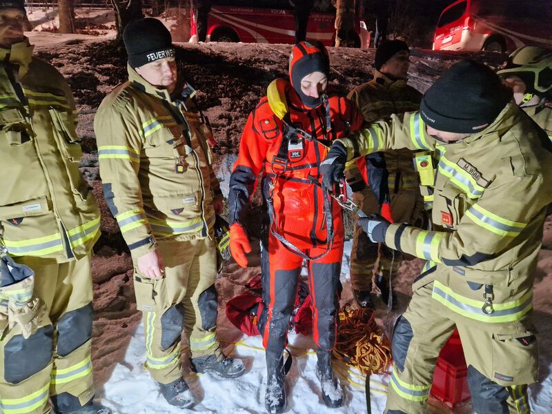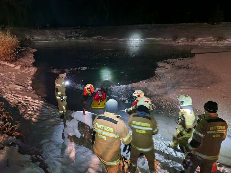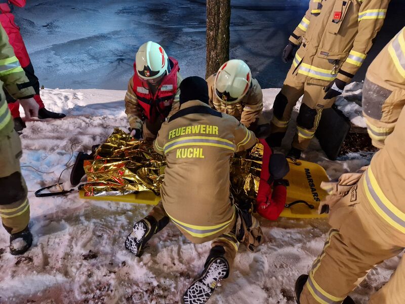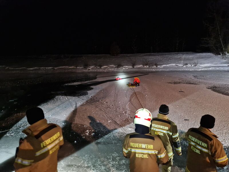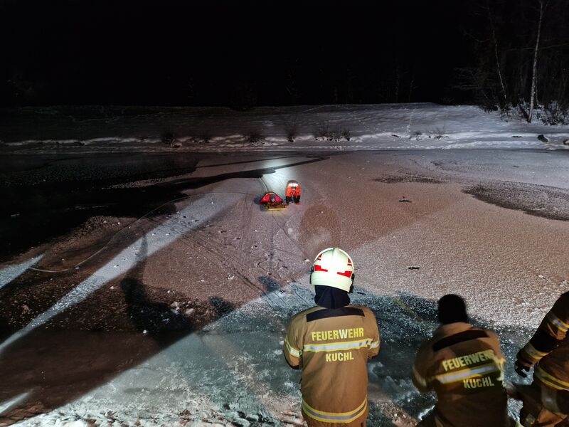 Aufgrund der anhaltend tiefen Temperaturen und der damit verbundenen Eisflächen im Kuchler Ortsgebiet wurde vom Ausbildungsleiter der Freiwilligen Feuerwehr Kuchl OBI Martin Wimmer kurzfristig eine Übung zum Thema Eisrettung organisiert.