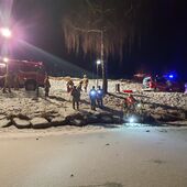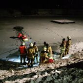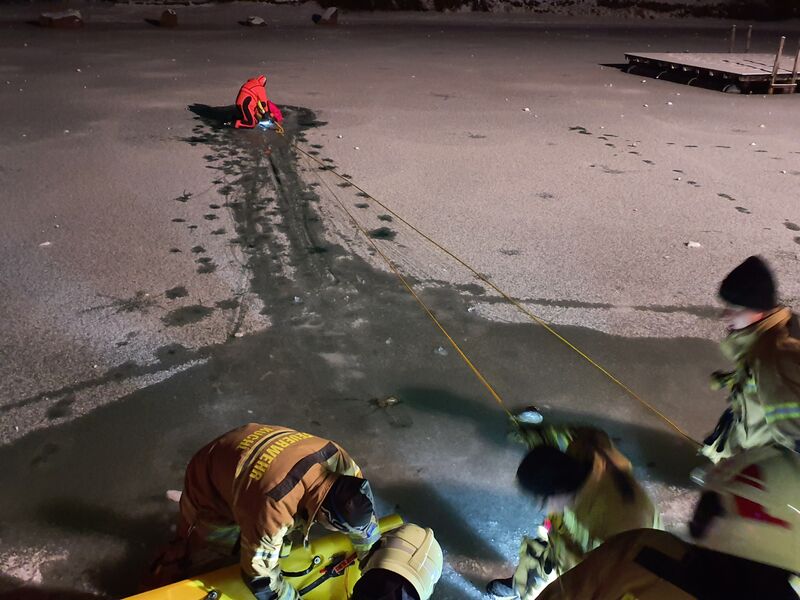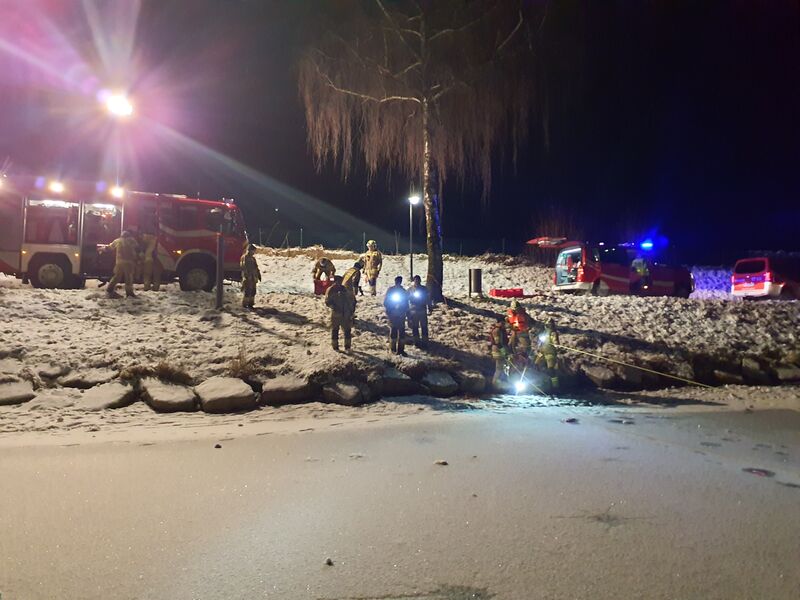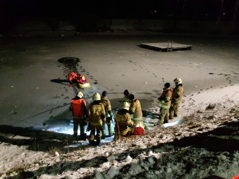 Nach einem kurzen Theorieteil mit Schulungsvideo und Trockentraining am Eisretterschlitten machten sich drei Einsatzkräfte als Übungsdarsteller auf den Weg zum Bürgerausee. Kurz darauf erfolgte die Alarmierung über Funk und die Übung wurde wie ein realer Einsatz abgehandelt. Unter dem Motto "Faktor Zeit" konnten wir die in der Eisfläche eingebrochene Person innerhalb kürzester Zeit an Land retten. Im Anschluss wurde die betroffene Person nach den Richtlinien der Erste Hilfe bei Eisunfällen stabilisiert. Dabei wurde besonders darauf geachtet, die Person möglichst wenig zu bewegen, sie mit eigener Körperwärme zu wärmen und unter ständiger Beobachtung langsam wieder auf normale Körpertemperatur zu bringen.