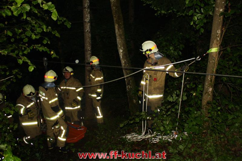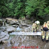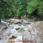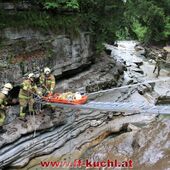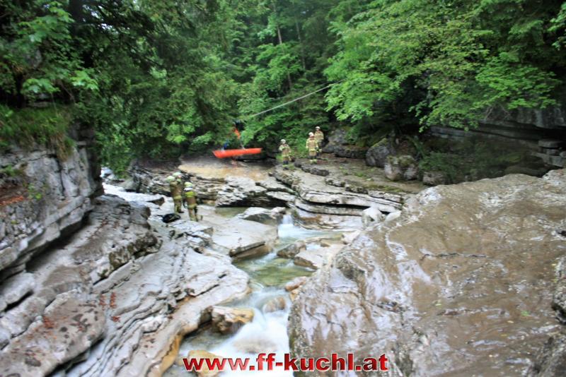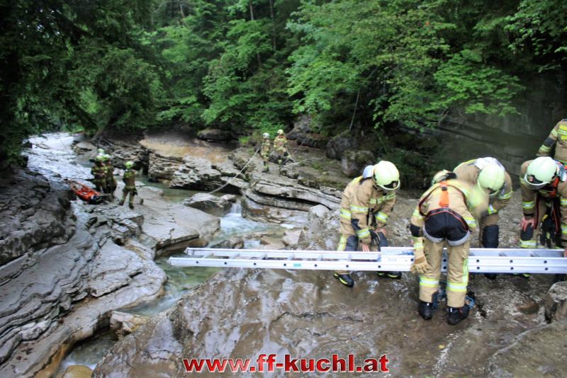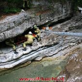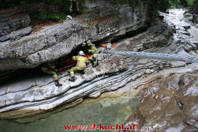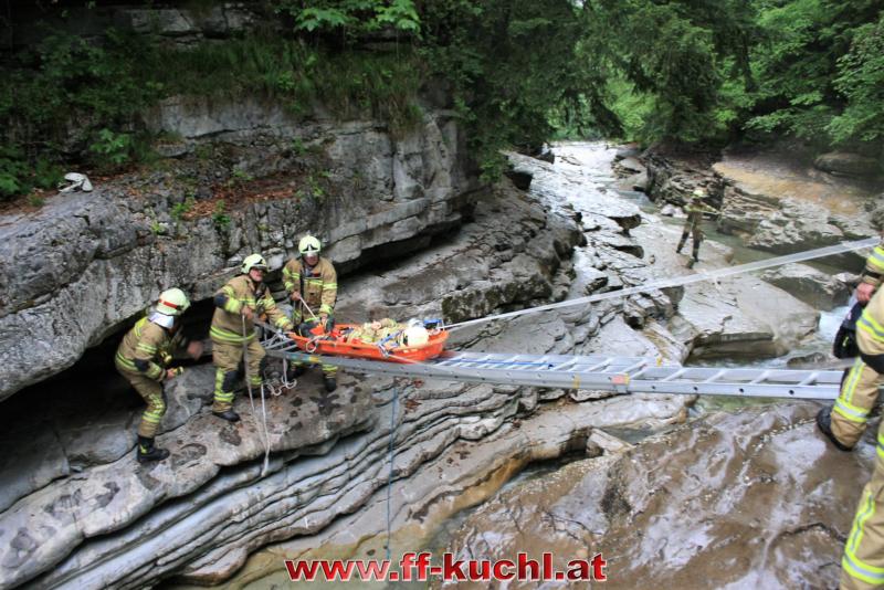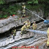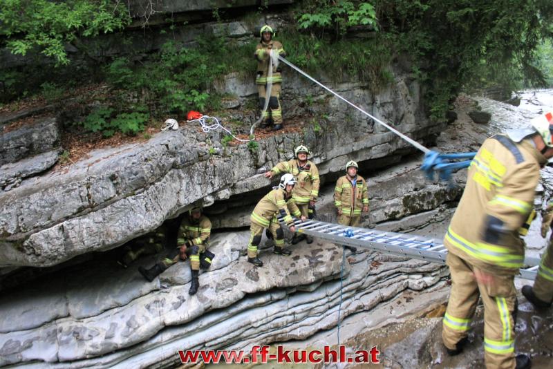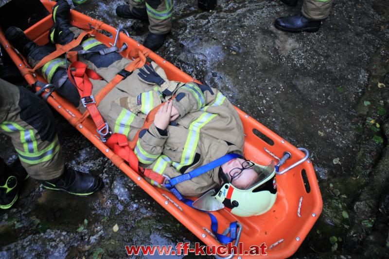 Aber nicht nur die leitenden- und Chargendienstgrade waren bei dieser Einsatzübung an der Taugl gefordert, auch die Mannschaft musste nach der erfolgreicher Suchaktion, bei der Personenrettung das vorhandene Wissen und die Fachkompetenz in der Praxis anwenden. Die Verhältnisse waren durch das felsige Gelände in der Tauglschlucht und die äußeren Witterungseinflüsse nicht gerade einfach.