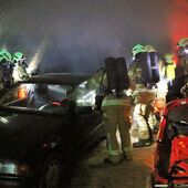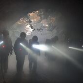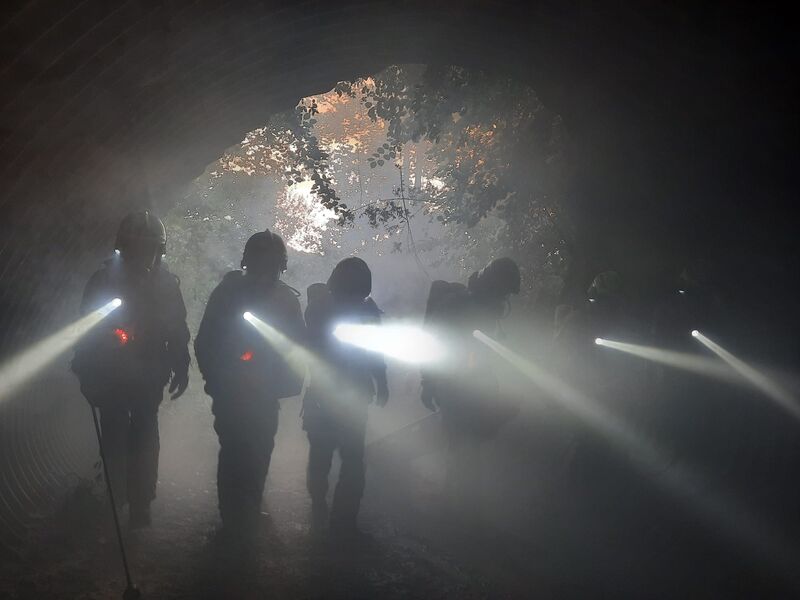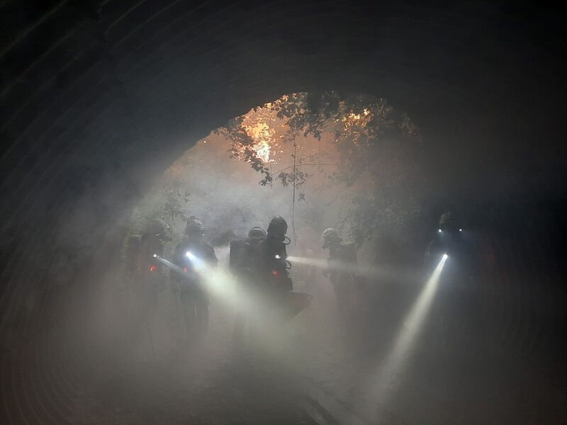Bei der zweiten Station die Mannschaft im Bereich „Suchen und Retten“ ein. Nach der theoretischen Vorbereitung und dem Ausrüsten der Trupps folgte die schweißtreibende praktische Umsetzung im Übungstunnel. Das aufwendig vorbereitete Übungsszenario forderte die Feuerwehrmitglieder mit lauter Lärmbelastung, völliger Dunkelheit und Verrauchung. Der Tunnel und mehrere Fahrzeuge mussten durchsucht und gefundene Personen gerettet werden.