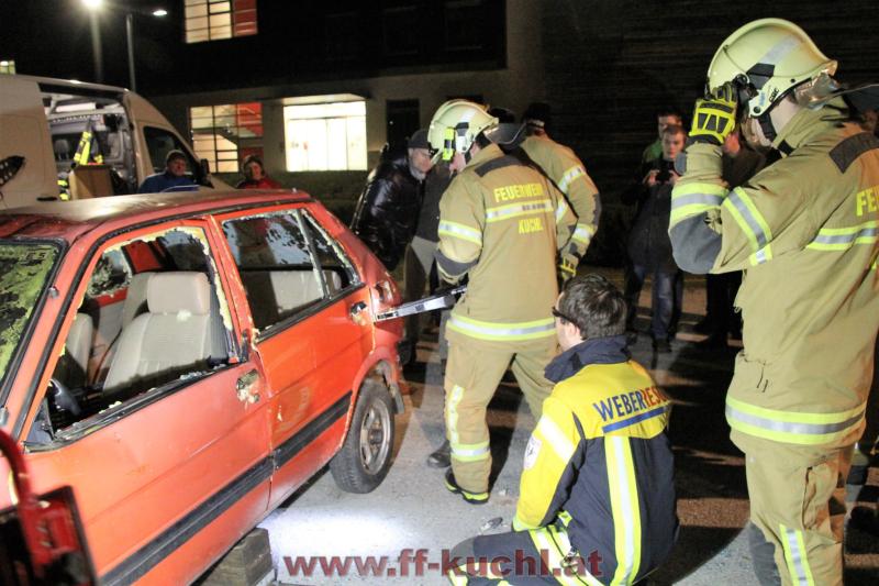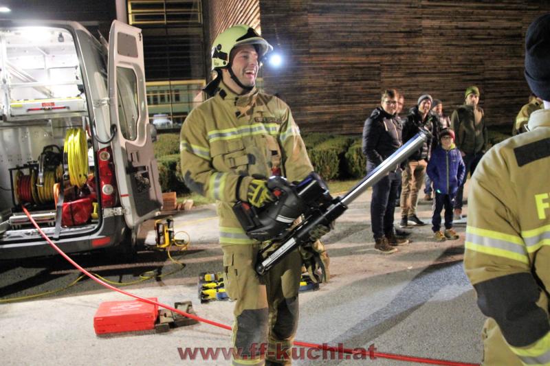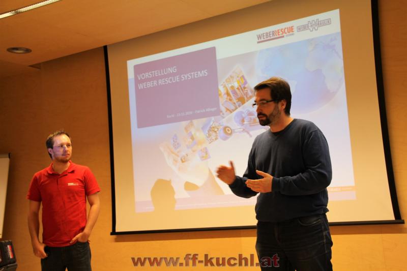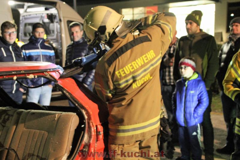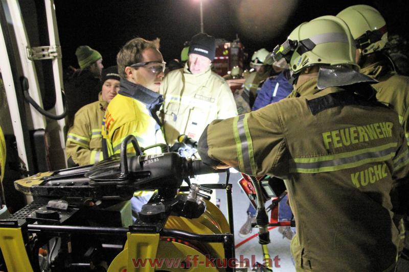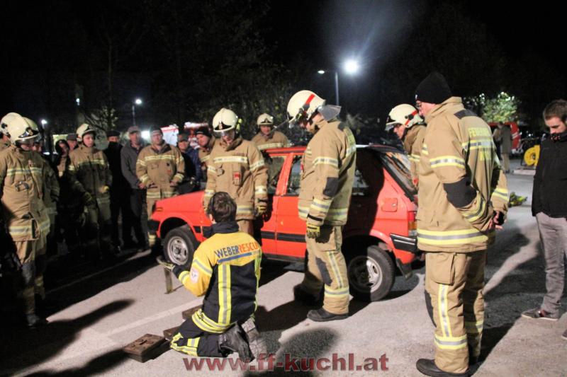 Nach einem theoretischen Vortrag und Vorstellung der Firma konnte der praktische Teil folgen. Zu diesem Ausbildungsabend waren von Seiten der Freiwilligen Feuerwehr Kuchl interessierte aktive Mitglieder und die Senioren eingeladen. Ortsfeuerwehrkommandant ABI Rupert Unterwurzacher erklärte den Senioren, die zu früher geänderte Vorgangsweise bei Verkehrsunfällen. Unter der Anleitung von Produkt-Manager Patrick Allinger von Weber Rescue, wurde anschließend speziell auf das "Stab Pack" eingegangen, die verschiedene Einsatzvarianten durchgespielt und danach die verschiedenen Geräte ausgiebig probiert.