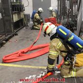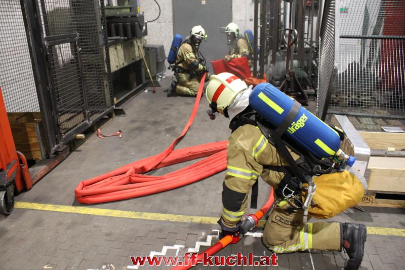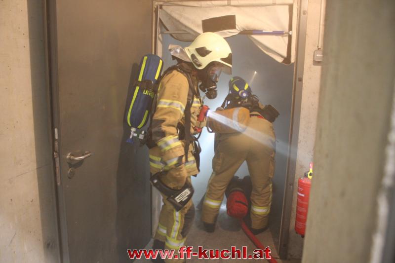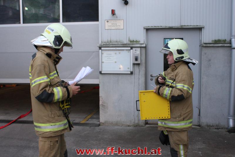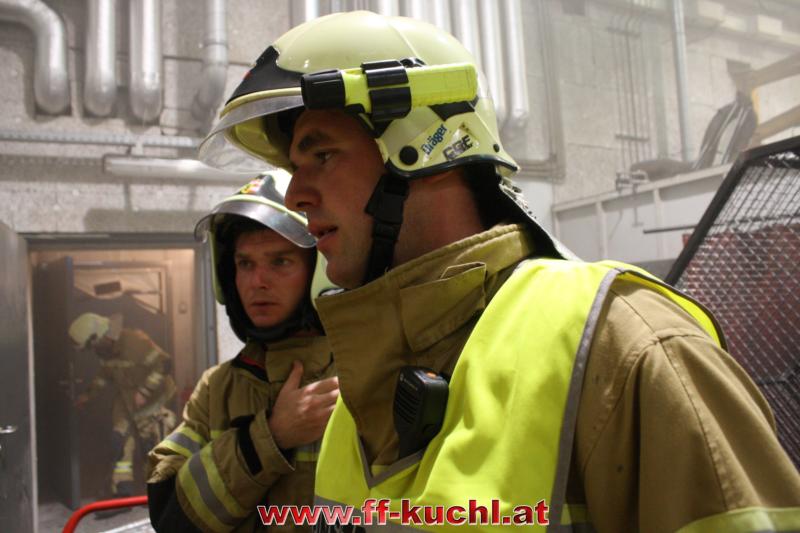 Nach dem Einsatzbefehl rückten die jeweiligen Fahrzeuge der Hauptwache Kuchl und vom Löschzug Jadorf in zeitrealistischen Abständen ab. Als "Einsatzleiter" erkundete Bm Johannes Struber mit seinem Melder, Lm Richard Russegger an Hand des Brandschutzplanes das Gebäude. Brand in der Heizungsanlage (Rauchgrenze) ...