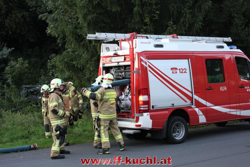 In der weiteren Folge lief die Übung wie im "richtigen" Feuerwehreinsatz ab: Atemschutztrupp Tank Kuchl zur Brandbekämpfung mit Tragekorb und Schlauchpaket vor; Atemschutzüberwachung; Überdruckbelüfter in Stellung bringen; Wasserbezug durch Pumpe Kuchl und Pumpe 1 Jadorf vom Kertererbach; Pumpe 2 Jadorf - Abschnittsbildung an der Südseite; Last Kuchl Verkehrsregelung und Absichern der Einsatzstelle; Rüstlösch Kuchl Unterstützung von Tank Kuchl und Atemschutz; Atemschutzsammelplatz errichten ...