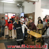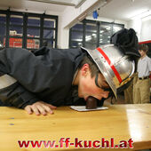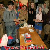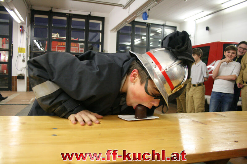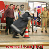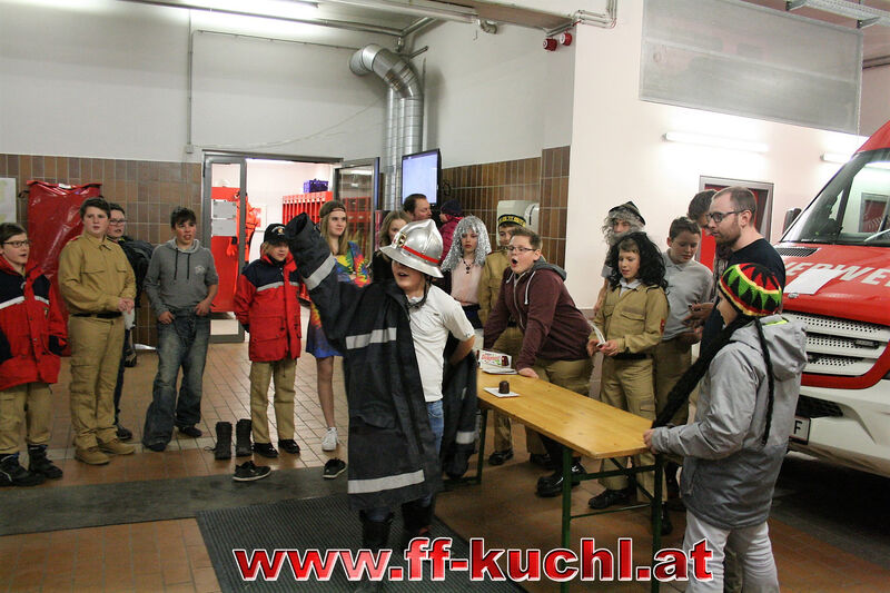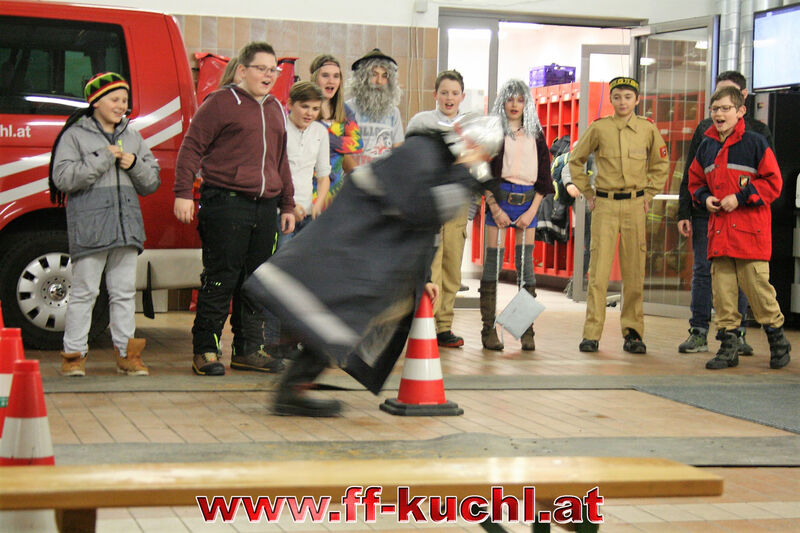 Auch Spaß muss bei der Feuerwehrjugend sein und wenn das dann noch – so wie beim traditionellen Faschingsbewerb – mit einem Feuerwehr-Parcours verbunden ist, dann ist das einfach ideal. Jugendbetreuer HV Rupert Unterwurzacher erklärte den verkleideten Jugendlichen den Faschingsbewerb: Zuerst galt es, eine alte blaue Einsatzjacke; viel zu große Stiefel und den alten Helm so schnell als möglich anziehen und dann den Hindernislauf zu bewältigen. Danach durfte man, einen „Dickmann“ - ohne die Hände zu verwenden – verschlingen. Überraschender Weise war bei einem der Jugendlichen (JFm Pfister Johannes) die Süßigkeit mit Senf verfeinert.