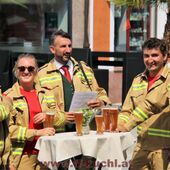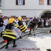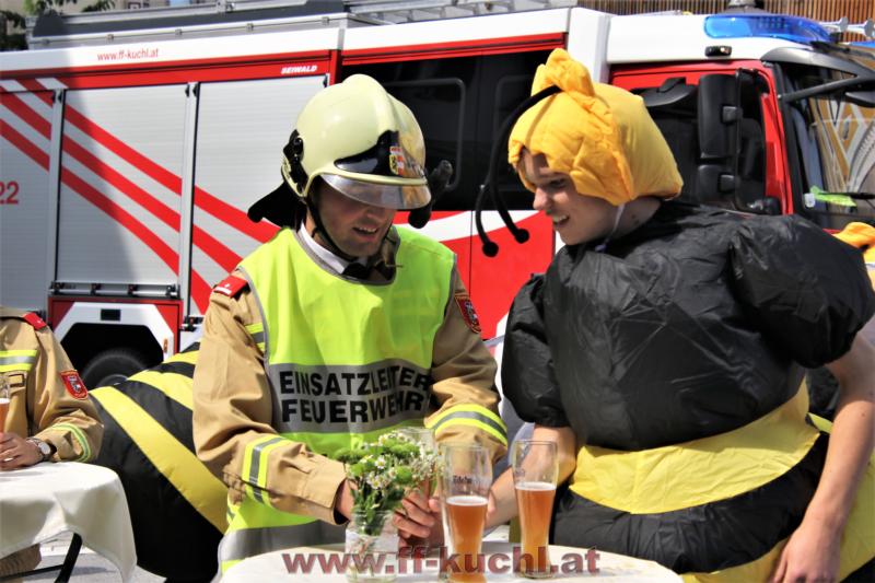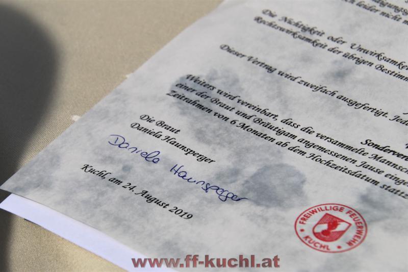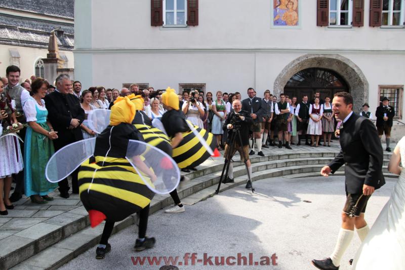 Das Team um Oberwespe V Stefan Gonei Brandauer hatte sich etwas Besonderes einfallen lassen. Nach der Trauung wurde das frischvermählte Brautpaar an der Weißbierbar empfangen. Leider bedrohten zahlreiche Wespen die junge Braut und so durfte Andi all sein Wissen und Können einsetzen, um die Braut und die gesamte Hochzeitsgesellschaft zu retten. Nach der erfolgreichen und schonenden Wespenvertreibung war die Braut dermaßen erleichtert, dass sie mit Freude den traditionellen Hochzeitsvertrag mit der Feuerwehr unterschrieb, indem das weitere Feuerwehrleben von Andi in allen wichtigen Punkten abgesichert wurde ...