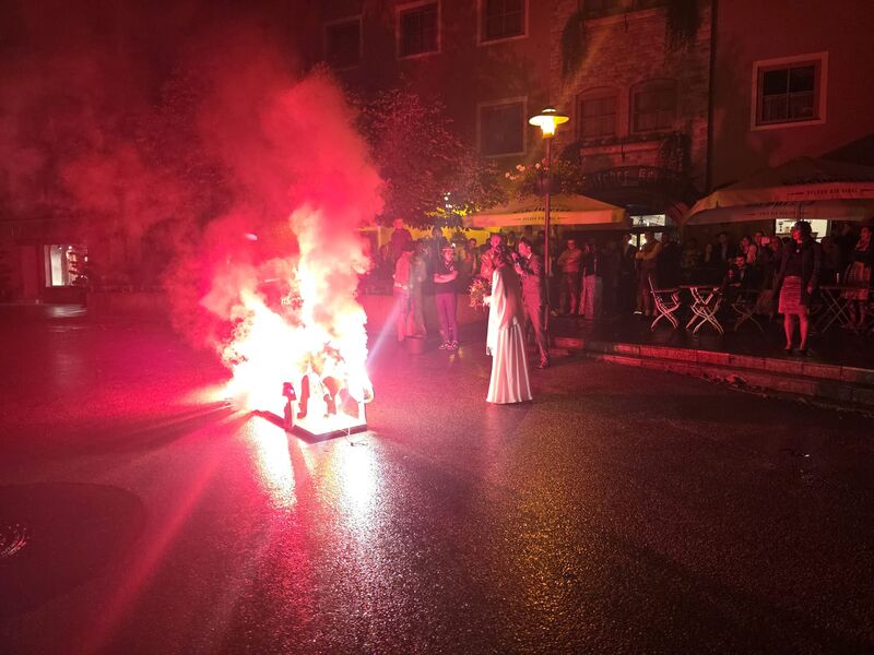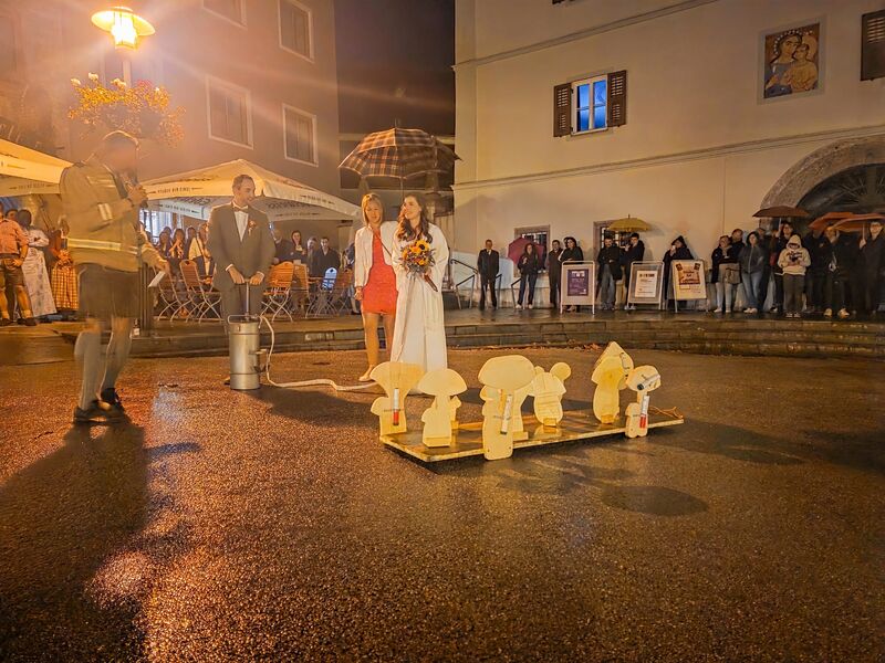 Um 18:30 Uhr startete der offizielle Empfang beim Römischen Keller, währenddessen die Alarmierung über Piepser und Handsirene – „Pilztransporter im Ortskern Kuchl in Flammen!“