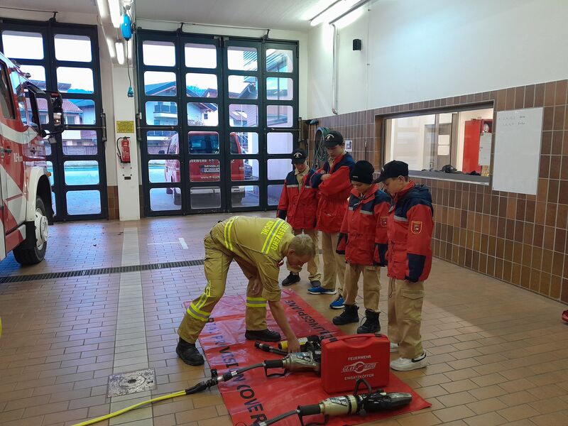 Nach einer Einschulung von Bm Richard Russegger und Lm Andreas Struber hatten die Jugendlichen die Aufgabe, das Fahrzeug zu sichern und eine eingeklemmte Person aus dem Fahrzeug mit dem hydraulischen Rettungsgerät zu retten.