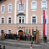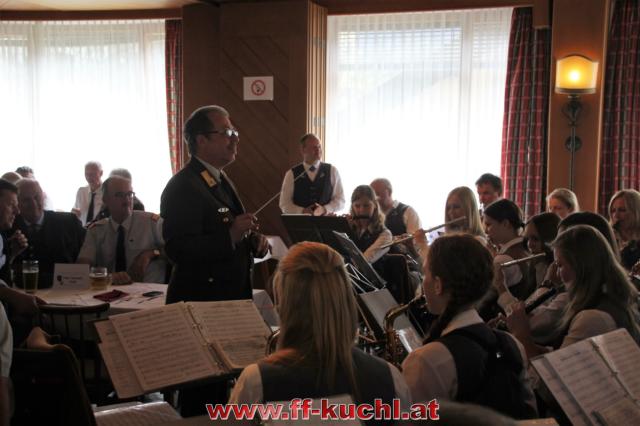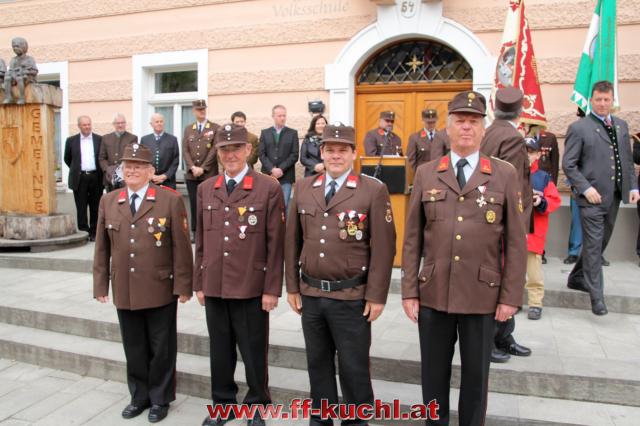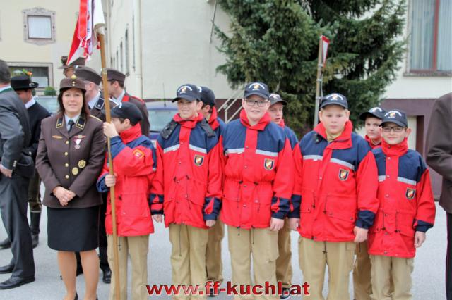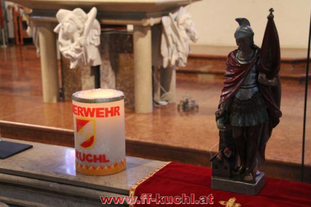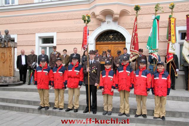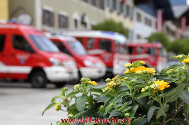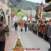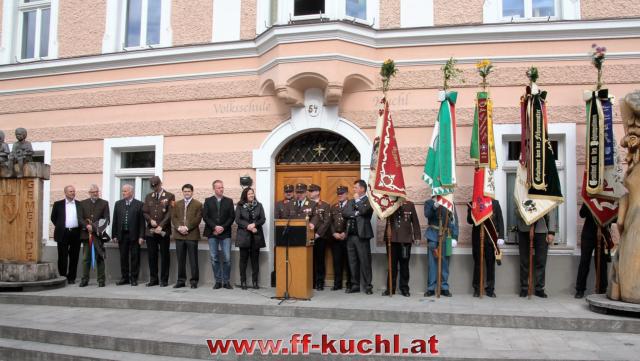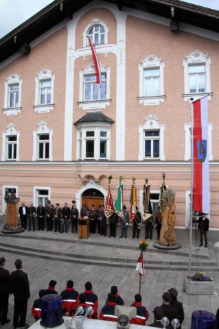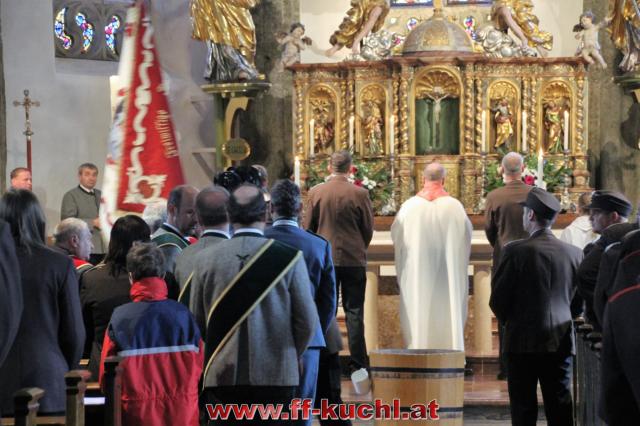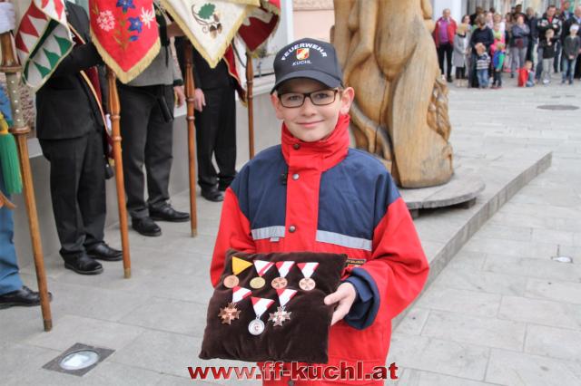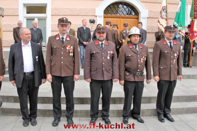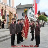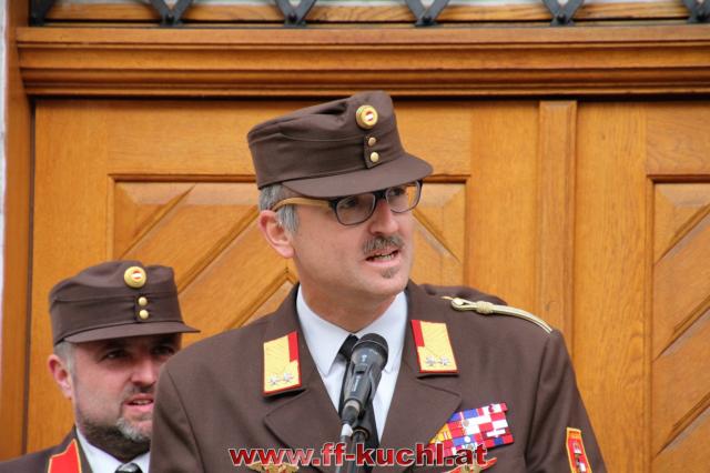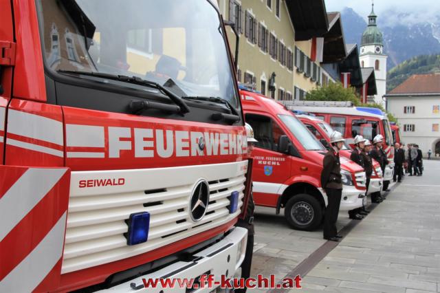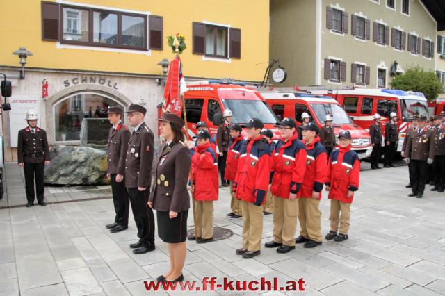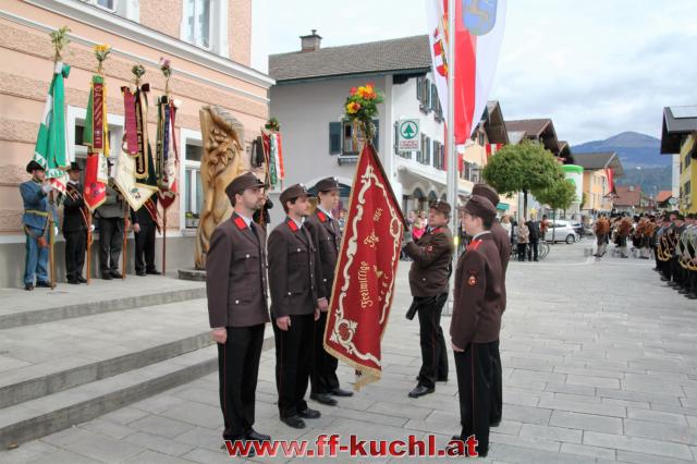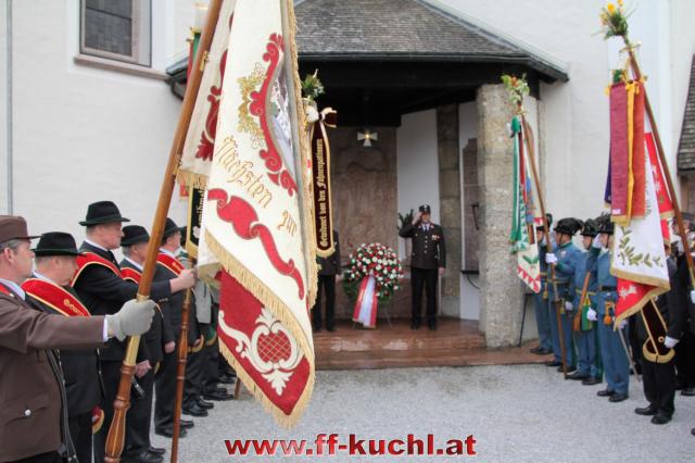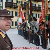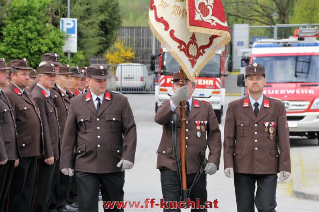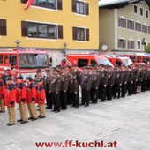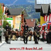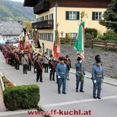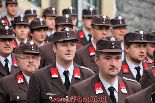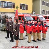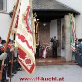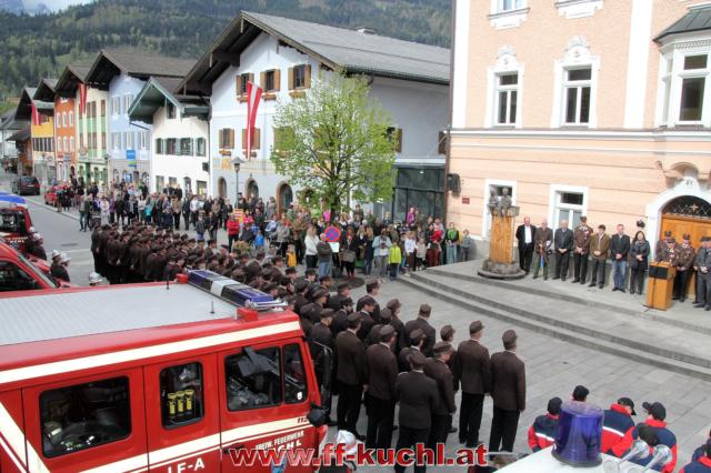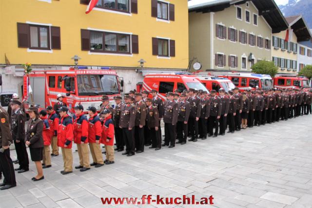 Insgesamt 202 Teilnehmer marschierten durch den Markt, um im Friedhof zuerst der verstorbenen Mitglieder zu gedenken. Anschließend zelebrierte Pfarrer Mag. Gerhard Mühlthaler die Florianimesse, feierlich umrahmt in bewährter Weise von der Musikkapelle Kuchl. Beim Aufmarsch - angeführt von der Schnalzergruppe Kuchl und den Fahnenabordnungen, begrüßten wieder zahlreiche Kuchlerinnen und Kuchler die Freiwillige Feuerwehr Kuchl am Marktplatz.