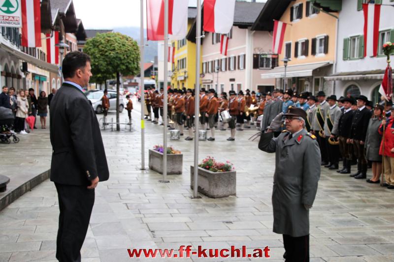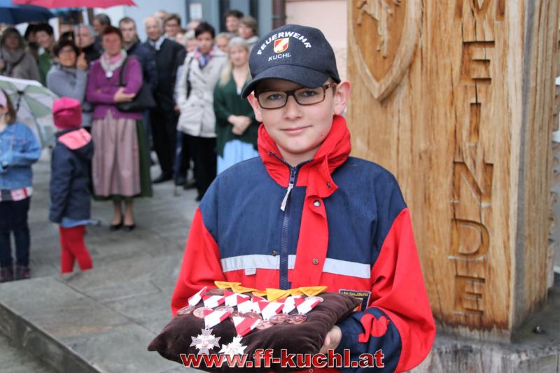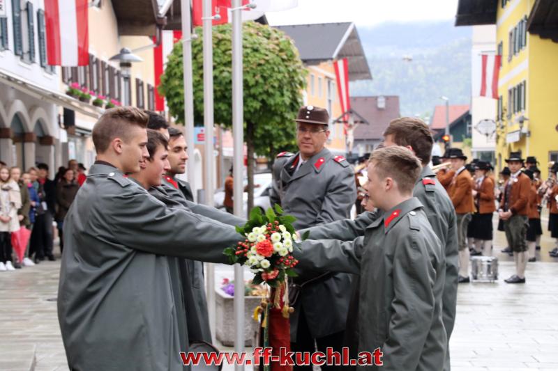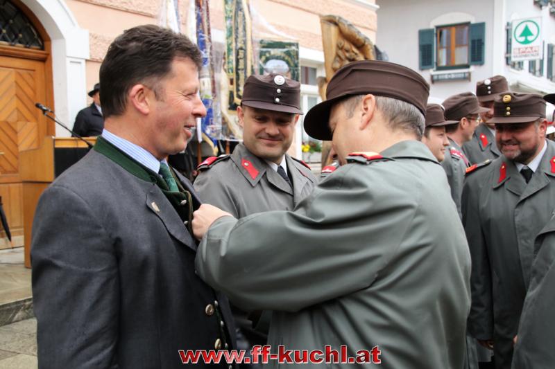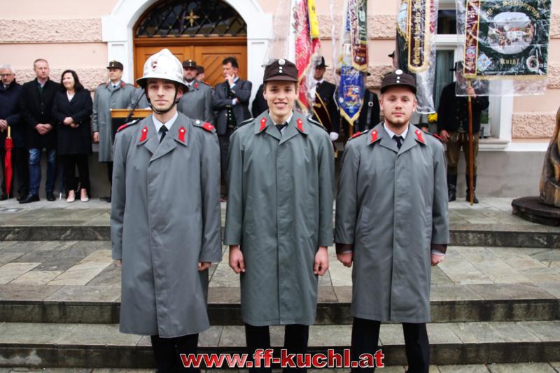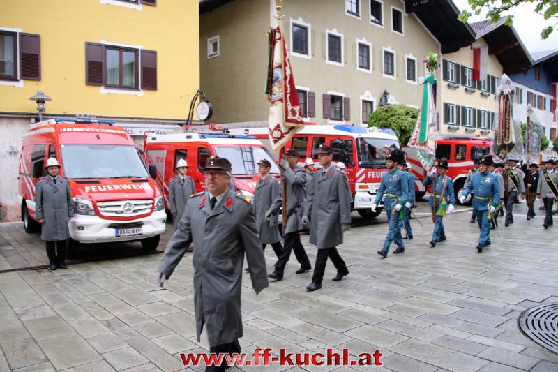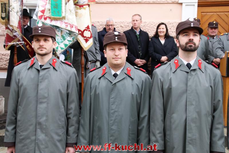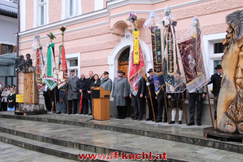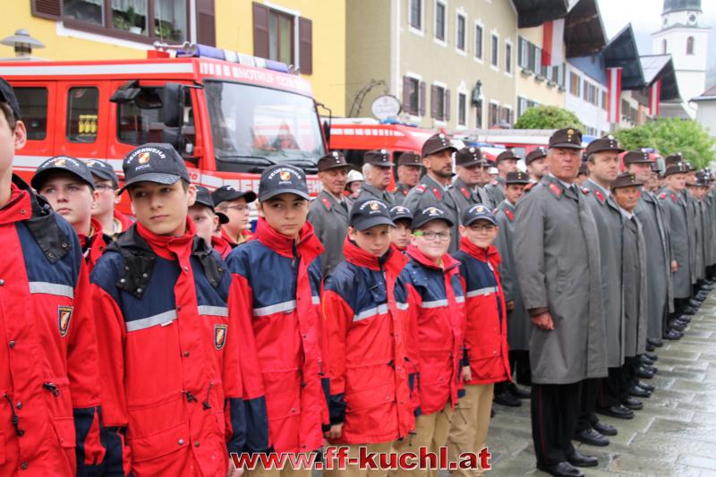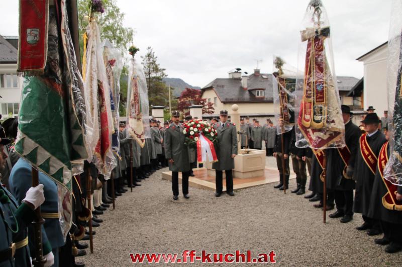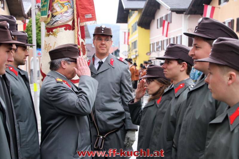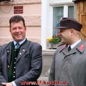 Trotz schlechtem Wetter und Regen fand der Florianitag der Freiwilligen Feuerwehr Kuchl unter Rekordbeteiligung statt. Neben den örtlichen Fahnenabordnungen, den Ehrengästen und der Musikkapelle Kuchl nahmen genau 130 Feuerwehrmitglieder der Hauptwache Kuchl und vom Löschzug Jadorf daran teil. Nach dem Gedenken an die verstorbenen Mitglieder konnte zusammen mit Pfarrer Gerhard Mühlthaler - wunderschön umrahmt von der Musikkapelle Kuchl - die hl. Messe gefeiert werden.