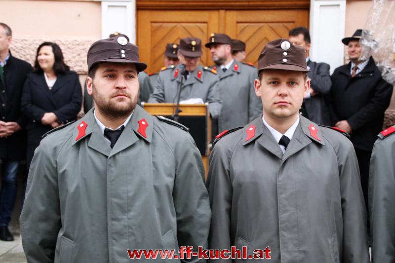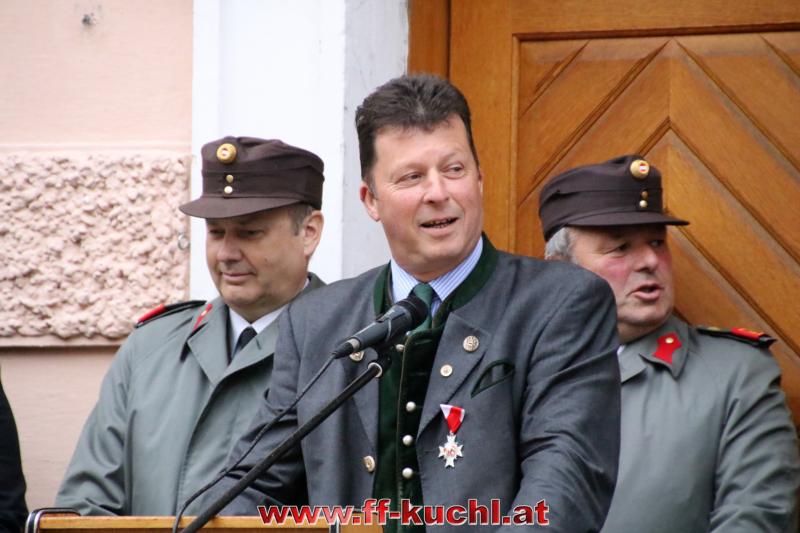 Nach einem kurzen Rückblick über das vergangene Jahr mit 171 Einsätzen - 121 Übungen und Schulungen - 62 Lehrgangsbesuchen und vielen sonstigen Ausrückungen und einem Aufwand von 110 Stunden pro Mitglied (insgesamt: 199 aktive, nichtaktive und Feuerwehrjugendmitglieder) - konnte Ortsfeuerwehrkommandant ABI Rupert Unterwurzacher gleich acht neue Mitglieder in die Feuerwehrjugend Kuchl aufnehmen und ebenfalls acht neue Mitglieder als Feuerwehrmänner angeloben. Es folgten Beförderungen und Auszeichnungen für langjährige und verdiente Mitglieder. Eine besondere Ehre und Freude war die Auszeichnung von Bürgermeister Wimmer Andreas mit dem Ehrenzeichen des Salzburger Landesfeuerwehrverbandes 2. Stufe.