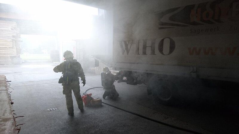 Die Übungsdarstellung hatte es für die Mannschaft in sich. Ein brennender LKW im Verladebereich einer Holzfirma, sowie 2 vermisste Personen.