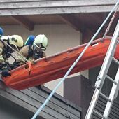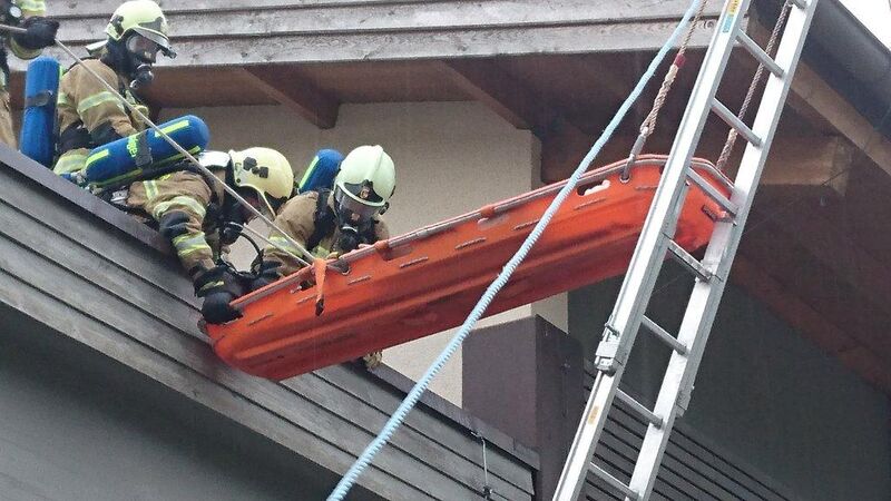 Zwei weitere Trupps fingen bereits mit der Personensuche im Gebäude und in den Geschäftslokal an. Nach wenigen Minuten konnte somit auch die erste Person gerettet werden. Die Rettung der zweiten Person, welche sich auf dem Dach des Gebäudes befand, wurde mittels Korbtrage und Steckleiternteile patientengerecht durchgeführt und zur weiteren Versorgung der Mannschaft übergeben.