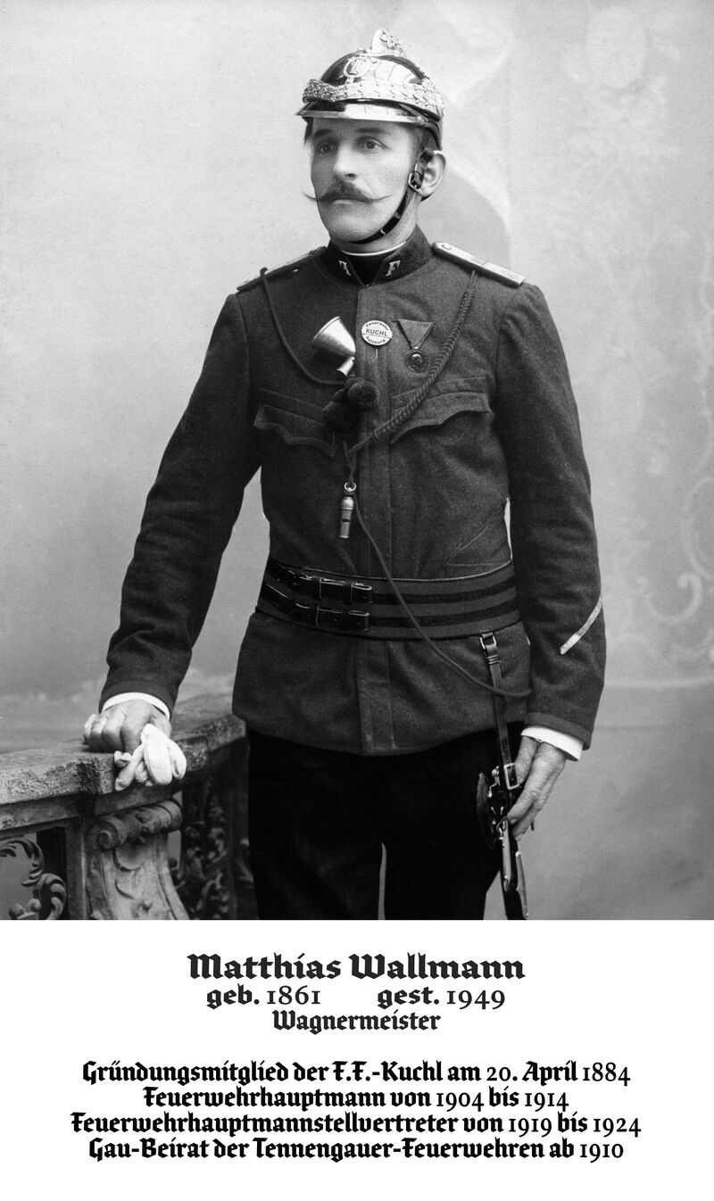 Helmut Wallmann – Wagnermeister aus Kuchl – forschte längere Zeit nach einer Feuerwehruniform, die um 1909 gebräuchlich gewesen war, um die Fotografie seines Urgroßvaters so authentisch wie möglich kolorieren lassen zu können. Der Urgroßvater – Matthias Wallmann (1861–1949) – war ebenfalls Wagnermeister und mit dem Käser Karl Bessler gut bekannt; beide gründeten zusammen mit 17 Kuchler Bürgern mit Fleiß und Leidenschaft im Jahre 1884 im Seethalers Gasthaus die Freiwillige Feuerwehr Kuchl. Das Engagement Matthias Wallmanns bei der „Hilfe am Nächsten“ beförderte ihn zum Feuerwehrhauptmann von 1904 bis 1914, zum Feuerwehrhauptmann-Stellvertreter von 1919 bis 1924 sowie zum Gau-Beirat der Tennengauer Feuerwehren (heutzutage Bezirksfeuerwehrkommando Tennengau) ab dem Jahr 1910. Sein Urenkel Helmut Wallmann (geb. 1961) ist ebenfalls seit 1977 aktives Mitglied der Freiwilligen Feuerwehr Kuchl und interessiert sich nebenbei auch für Allerlei Geschichtliches.