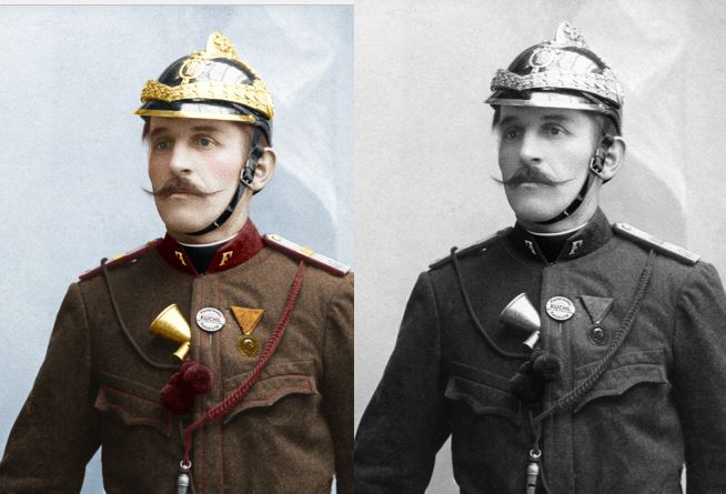 Für die Kolorierung der Fotografie ersuchte Helmut Wallmann das Landesfeuerwehrkommando Salzburg um Unterstützung. Diese sandten dankenswerterweise eine Mail-Anfrage an alle Feuerwehren Salzburgs aus, um eine auf der Fotografie entsprechende Original-Uniform zu finden und so deren Farbe endlich feststellen zu können. Leider blieb diese Anfrage ohne Erfolg.