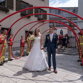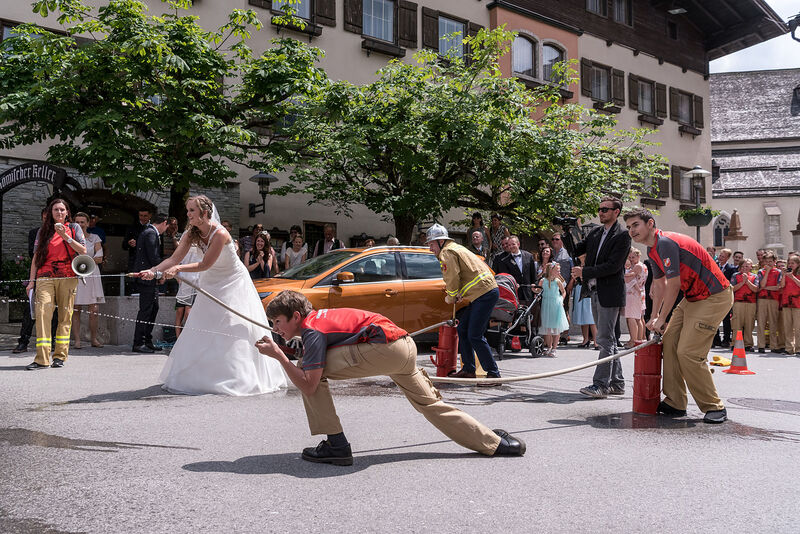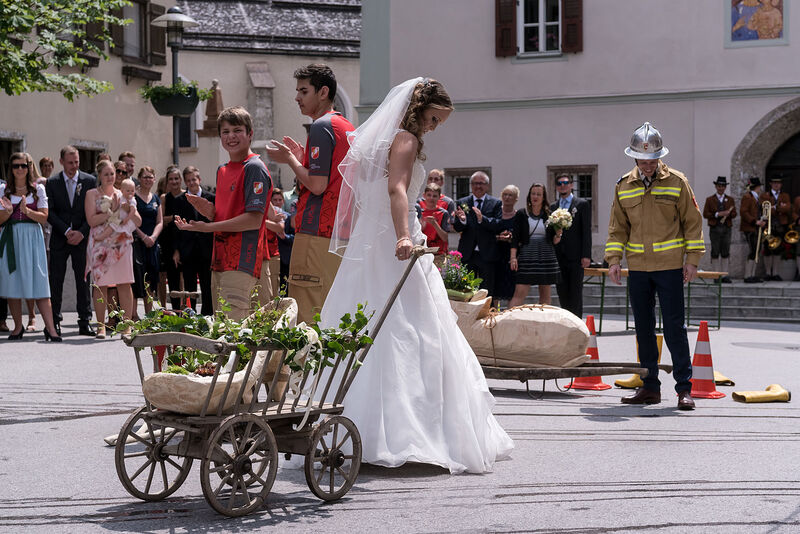 In der festlich geschmückten Pfarrkirche von Kuchl gaben sich Michaela und Rupert das Jawort. Wunderschön und stimmungsvoll umrahmt von der Trachtenmusikkapelle Kuchl und Sängerinnen feierten die Beiden zusammen mit ihren Freunden und Verwandten ihre Hochzeit. Natürlich mit dabei auch die Freiwillige Feuerwehr Kuchl, die die Hochzeitsgesellschaft nach dem feierlichen Auszug des Brautpaares unter den Klängen der Messner Fanfare aus der Kirche mit einem Feuerwehrspalier und einem Feuerwehrbewerb gegen die Feuerwehrjugend überraschten.