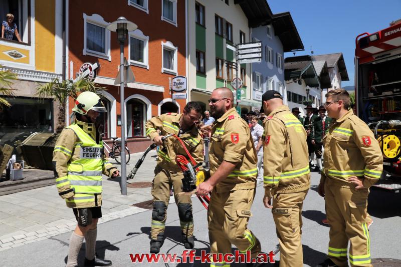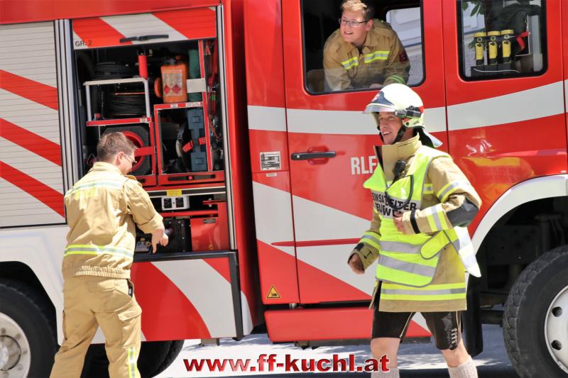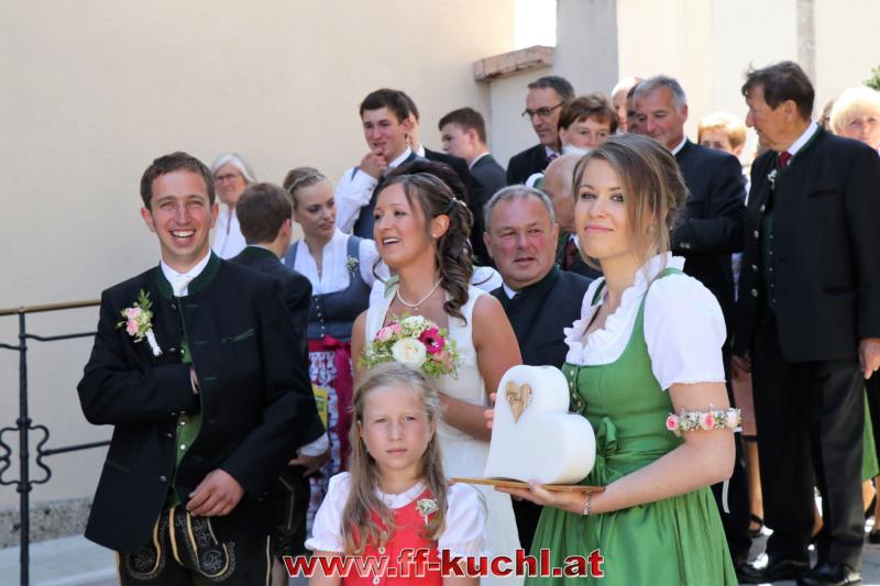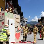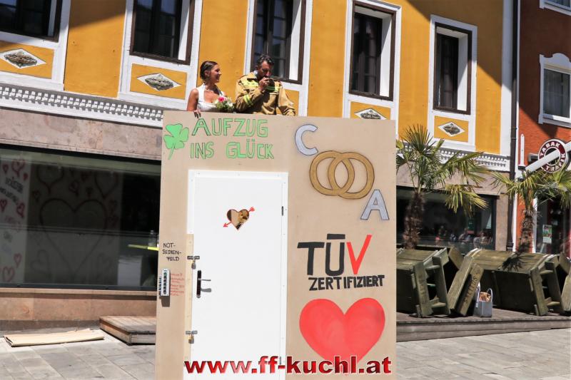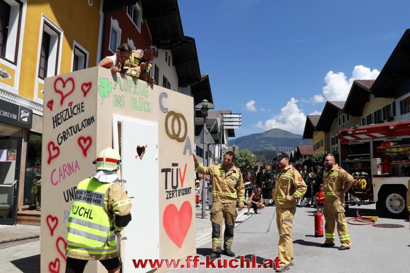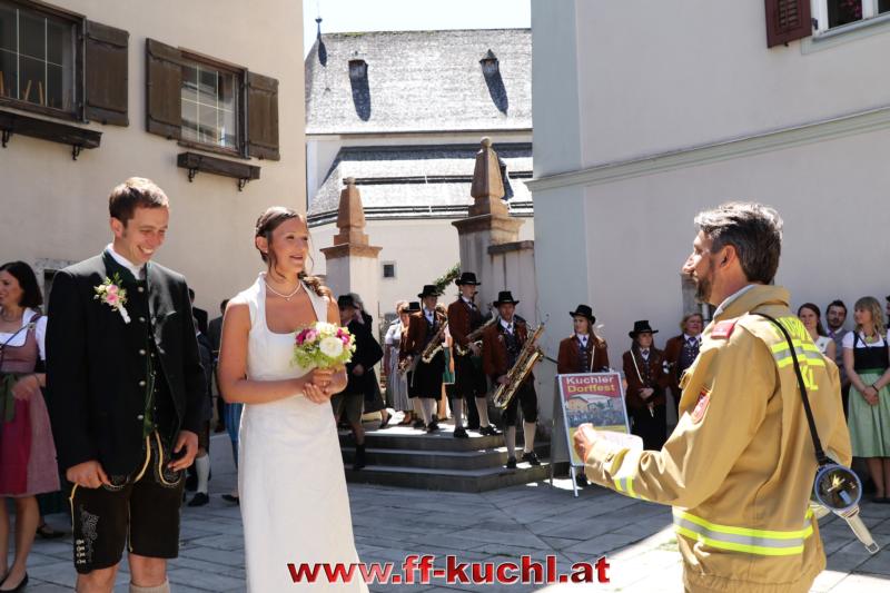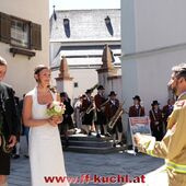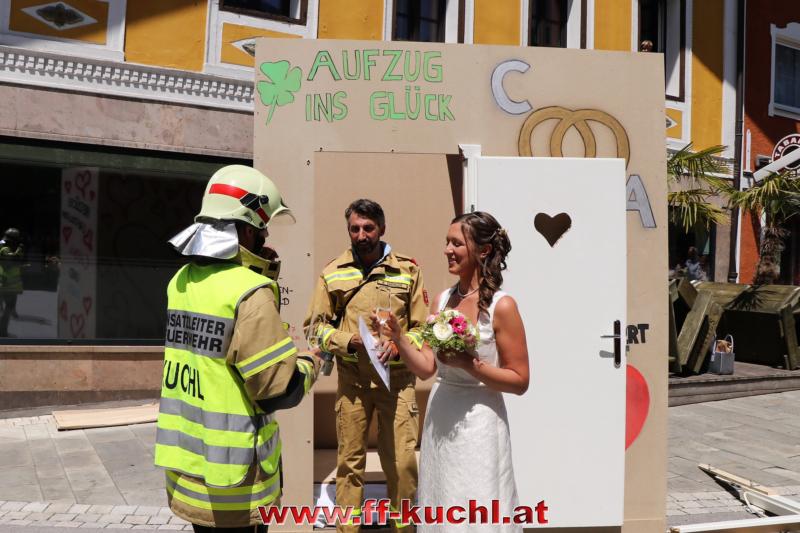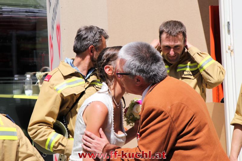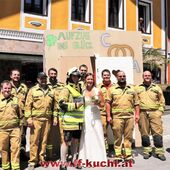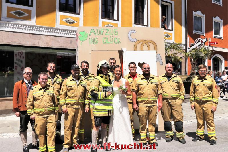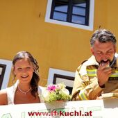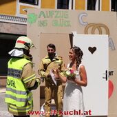 Bei herrlichem Wetter gaben sich Carina und Andreas in der Pfarrkirche Kuchl das Jawort und wurden anschließend am Marktplatz von der Feuerwehr überrascht. Für Andi, der beruflich bei der TÜV angestellt ist, war die Liftrettung seiner Ehefrau kein großes Problem und auch Carina erwies sich nach Unterschrift des entsprechenden Vertrages als würdige Feuerwehr-Ehefrau.
