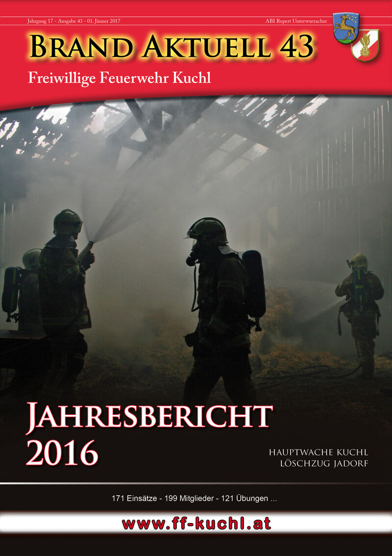Pünktlich zur Mitgliederversammlung 2017 wurde der Jahresbericht der Freiwilligen Feuerwehr Kuchl vorgestellt. Er umfasst in diesem ereignisreichen Jahr 48 Seiten und enthält alle Daten, Fakten und Zahlen. Darüber hinaus wird das Kuchler Feuerwehrbuch "Entflammt" mit allen Geschichten und Begebenheiten weiter geführt und mit vielen Bildern illustriert.