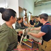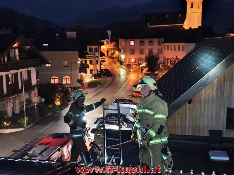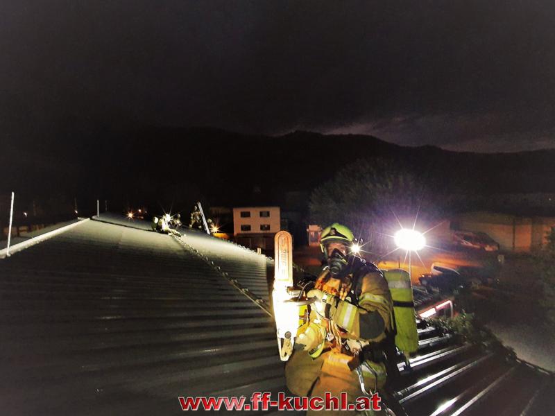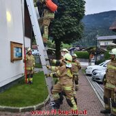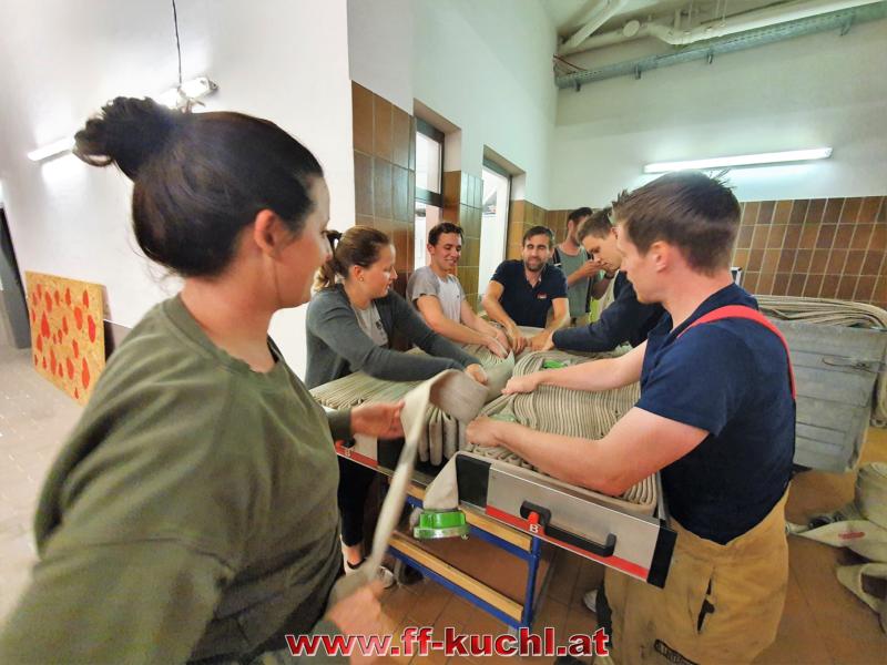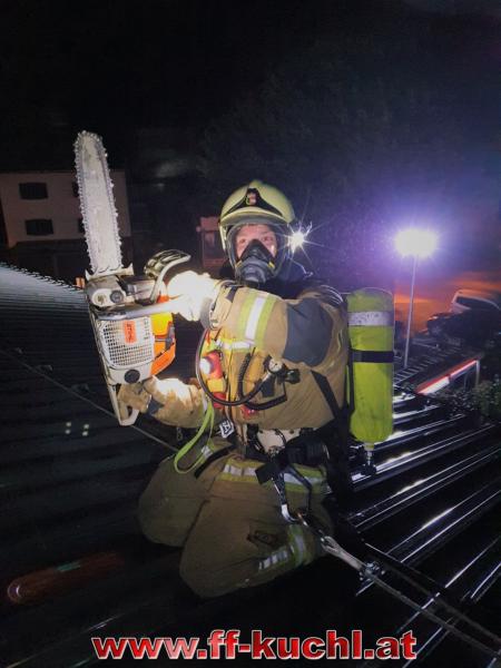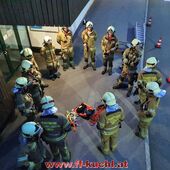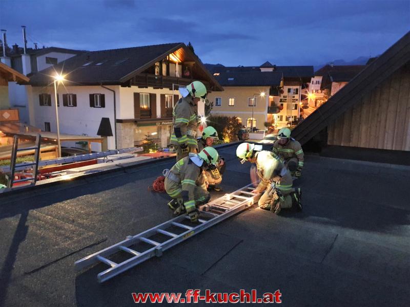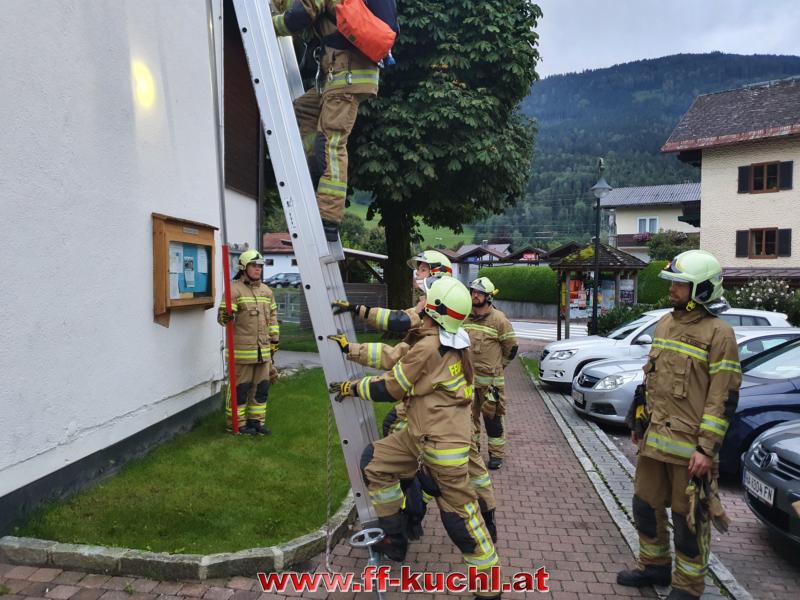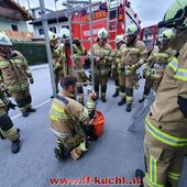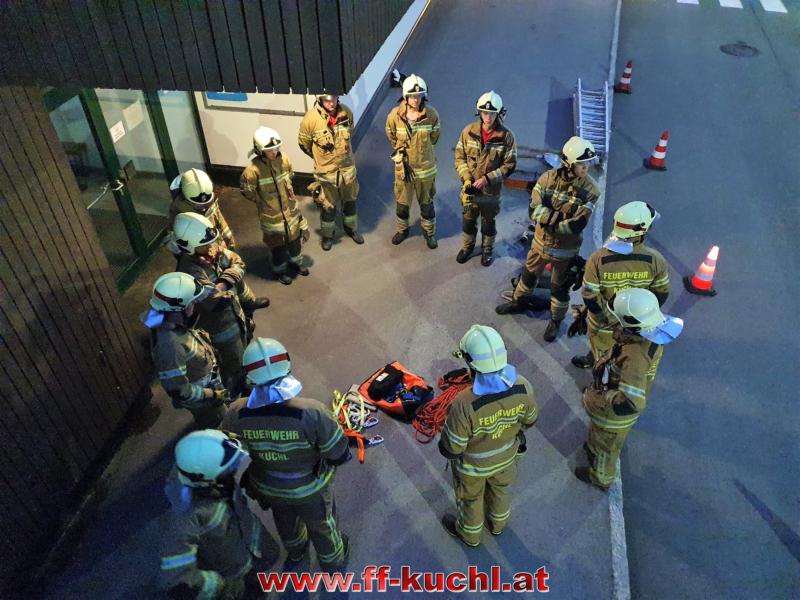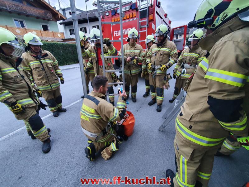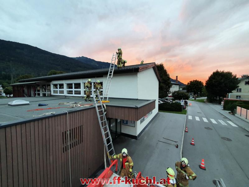 Das Thema Leitern - interessant gestaltet: Als Übungsobjekt diente die Schulturnhalle im Ortszentrum von Kuchl. Es wurde das Aufstellen der 14m-Leiter und von Steckleitern geübt. Ein wichtiger Aspekt war die Sicherheit bei Arbeiten auf einem Dach. Zusätzlich konnten die Atemschutzträger die im Land Salzburg neuen Überdruck-Atemschutzgeräte in der Praxis ausprobieren.