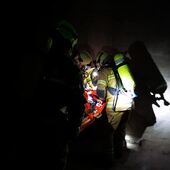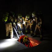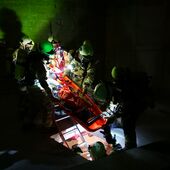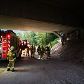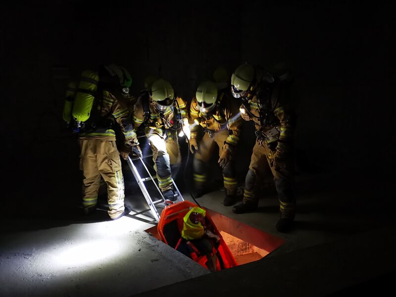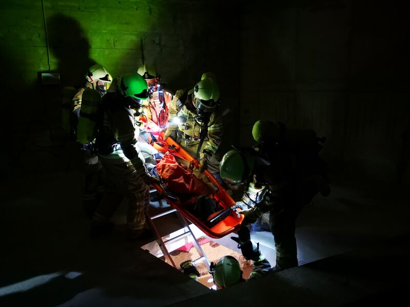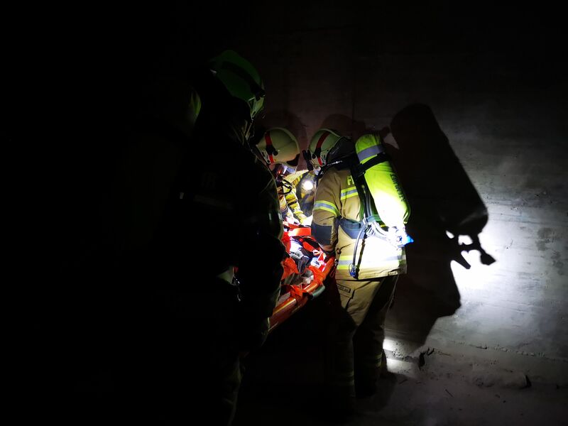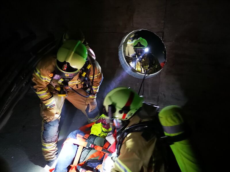 Während auf der Fahrbahn über den beiden Atemschutztrupps der Verkehr donnert, konnte die bewusstlose Person nach etwa hundert Meter in der Brücke aufgefunden werden. Die Sauerstoffversorgung des Verletzten wurde mithilfe einer Rettungshaube durch Luftzufuhr über die Pressluftatmer sichergestellt. Die schonende Rettung mittels Korbtrage erfolgte anschließend über den Angriffsweg. Über eine Schiebeleiter wurde der Verletzte durch die enge Zugangsöffnung aus dem Gefahrenbereich abgeseilt.