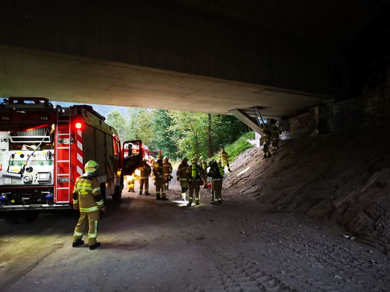 Übungsannahme: Nach einem Unfall bei Arbeiten in den Hohlkammern der Autobahnbrücke wird eine Person vermisst. Ein beißender Geruch im Inneren macht ein vorgehen mittels Atemschutz notwendig.