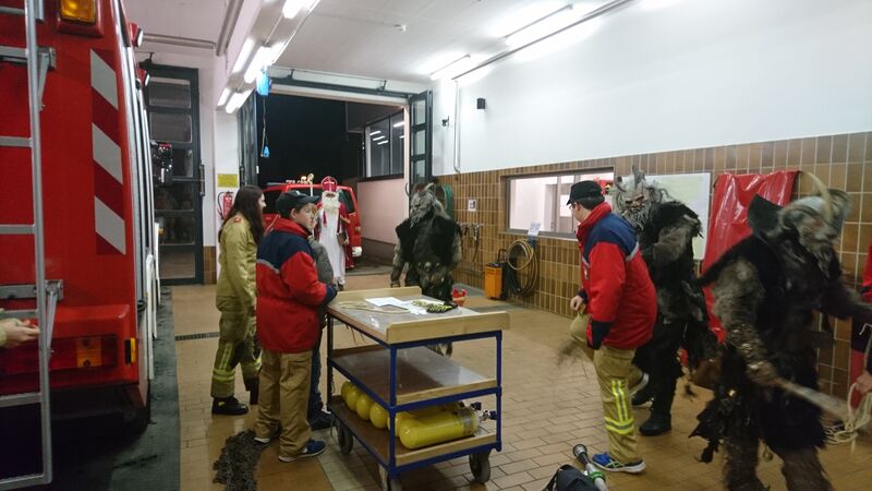 Während die Jugend fleißig die Knoten für die bald anstehende Erprobung übte ertönten die Glocken von Krampussen, welche sich dem Feuerwehrhaus näherten und unseren Jugendlichen einen Besuch abstatteten.