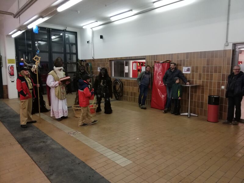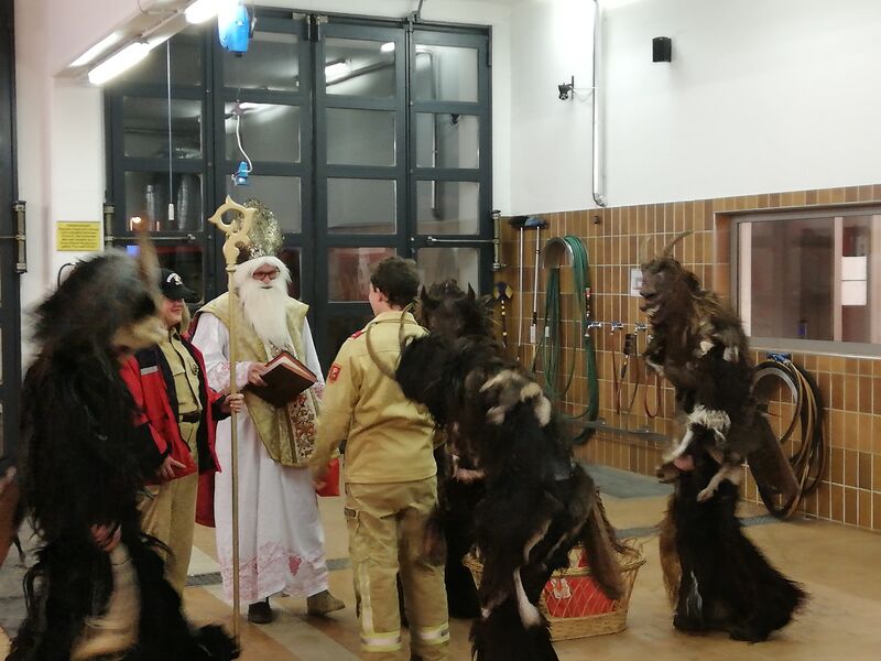 Nach dem Üben für die bald anstehende Erprobung wartete auf die Jugendlichen noch eine Überraschung. Plötzlich tauchte in der Fahrzeughalle der Nikolaus mit seinen Krampussen auf.