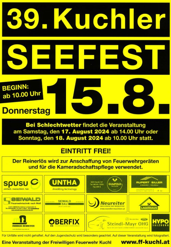 Am Donnerstag, den 15. August 2024 findet das diesjährige Seefest der Feuerwehr Kuchl statt. Beginn: 10:00 Uhr - freier Eintritt!