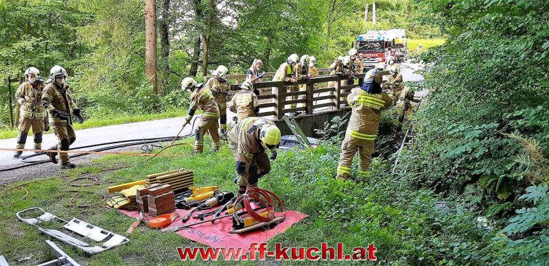 Aufbau des Arbeitsbereiches - Geräteablage, Brandschutz, Unfallstelle absichern, Verkehrsumleitung, Fahrzeug sichern und stabilisieren, Betreuung der Verunfallten, Rettung der eingeklemmten Personen mittels hydraulischem Rettungsgerät aus dem Fahrzeug, Rettung der drei Schwerverletzten aus dem Bachbett, Betreuung durch Notarzt und Rotem Kreuz, Reanimation, Fahrzeugbergung …