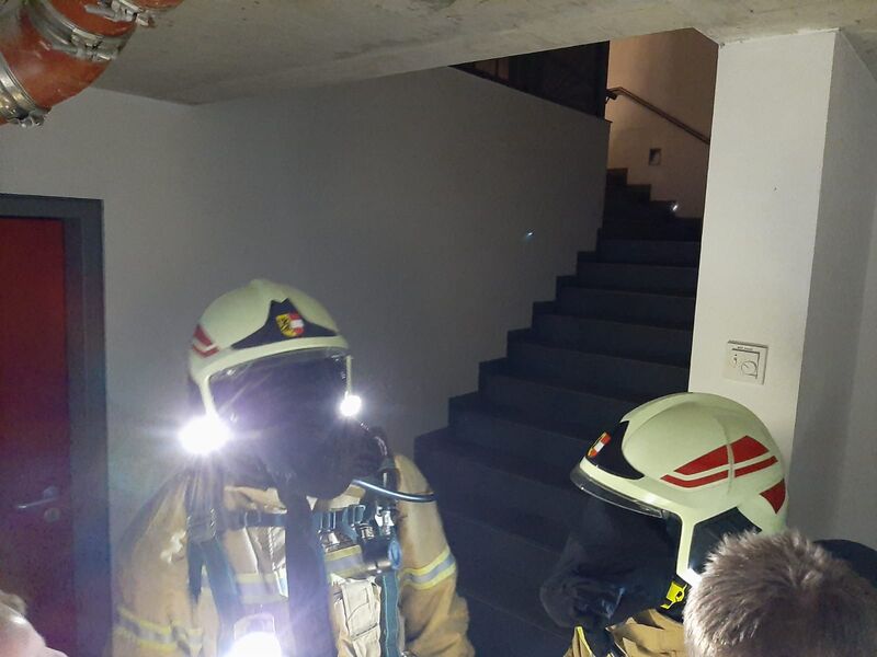 Eine Personenrettung bei sehr beschränkter Sicht wurde durchgeführt. Hierzu wurden den Atemschutzgeräteträger das Sichtfenster der Maske mit einer Stoffabdeckung verdunkelt.