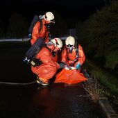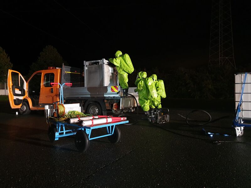 Übungsannahme war eine Gefahrengutunfall mit einer verletzten Person. Die Flüssigkeit musste unter Schutzstufe 3 umgepumpt werden. Des weiteren wurden die Personen dekontaminiert.