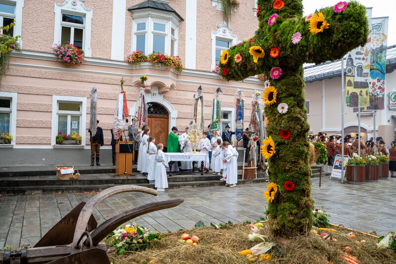 Am Sonntag, den 28. September, nahm die Freiwillige Feuerwehr Kuchl am traditionellen Erntedankfest teil. Trotz Regenwetters versammelten sich zahlreiche Vereine und die Kuchler Bevölkerung in der Marktstraße. Dort segnete Pfarrer Naidu Prakasam die kunstvoll gefertigte Erntedankkrone, musikalisch begleitet von der Musikkapelle Kuchl und dem Kindergartenchor.