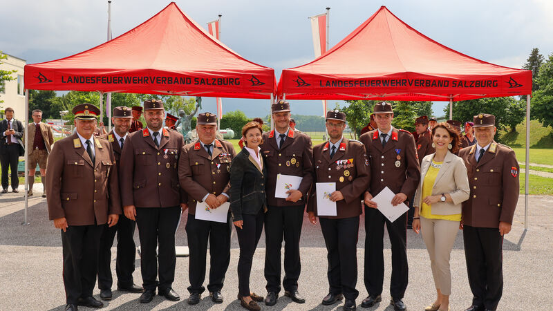 Im Rahmen der Übereichung wurden Herr Amtsdirektor Christian Krol BMI und Herr Landesfeuerwehrkommandant Dietmar Fahrafellner MSc. mit dem Ehrenzeichen des Landesfeuerwehrverbandes Salzburg in der 2. Stufe ausgezeichnet. Der Landesfeuerwehrkommandant FVPräs Günter Trinker bedankt sich bei beiden für die langjährige gute Zusammenarbeit. Ebenfalls erhielten Landesfeuerwehrkommandant FVPräs Günter Trinker, Landeshauptfrau Mag. Karoline Edtstadler und Landeshauptfrau-Stellvertreter Marlene Svazek BA. ein Ehrengeschenk vom Landesfeuerwehrkommandanten LBD Dietmar Fahrafellner.