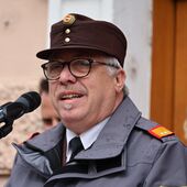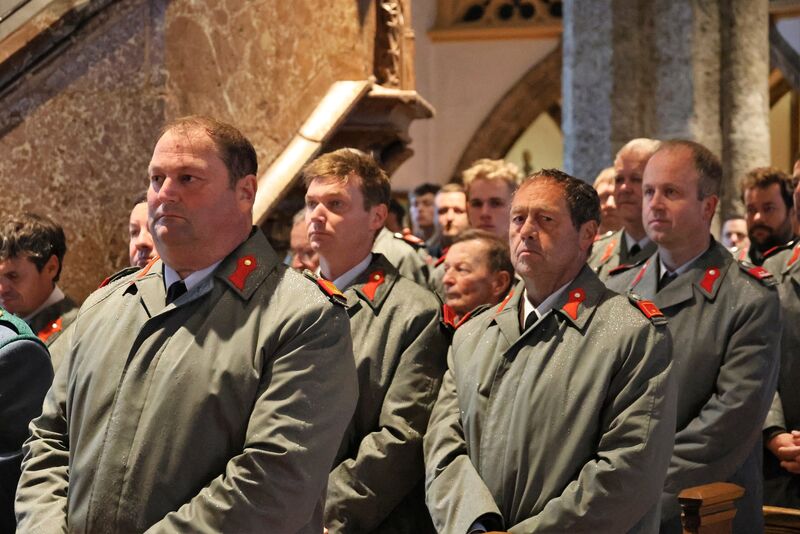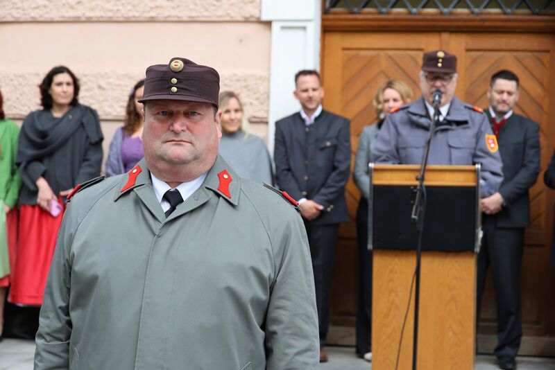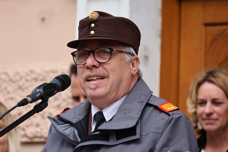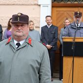 OFK ABI Gerhard Scherfl geht in seiner Rede auf unseren Schutzpatron den Hl. Florian ein. Der Heilige Florian steht als Symbol für Mut, Hilfsbereitschaft und Solidarität – Werte, die auch die Arbeit der Feuerwehr prägen. OFK ABI Gerhard Scherfl würdigt den freiwilligen Einsatz der Mitglieder der Feuerwehr Kuchl, die in Notlagen für andere einstehen und Verantwortung übernehmen.