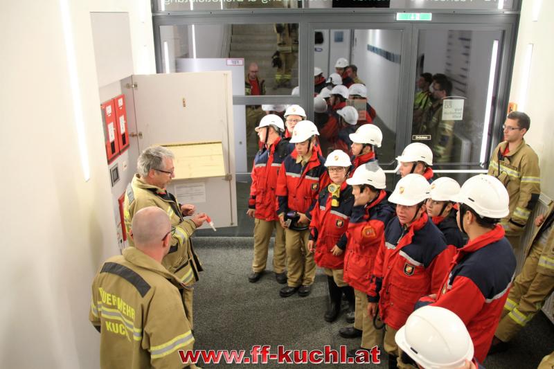 Als gegen Mitternacht erneut der Rufempfänger einen Alarm meldete, zeigten die Burschen wie schnell sie von null auf hundert kamen: Die Brandmeldeanlage im Holztechnikum Kuchl hatte ausgelöst. Ortsfeuerwehrkommandant ABI Rupert Unterwurzacher erklärte die wichtigsten Grundlagen bei einem Brandmeldealarm. Anschließend gab es durch Fm Stefan Vötter eine mitternächtliche Führung im Kuchler Schulzentrum.