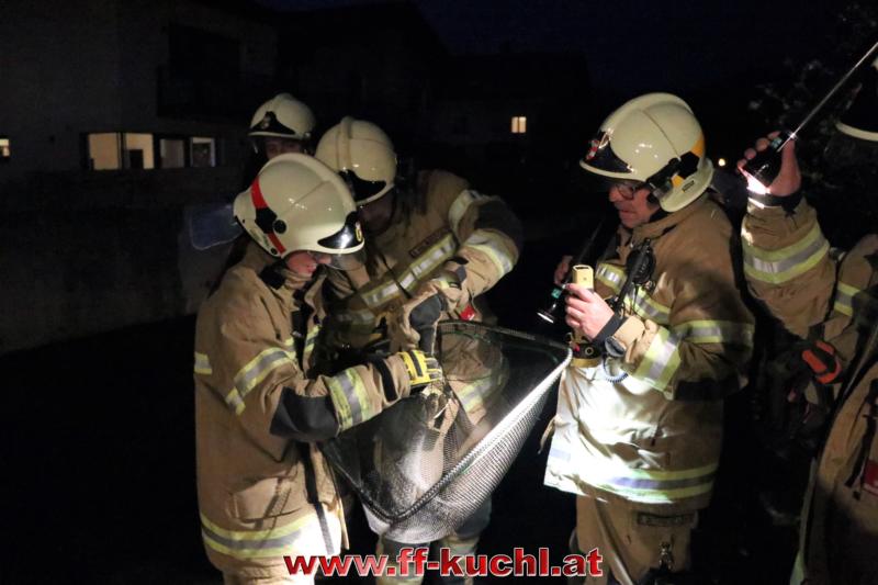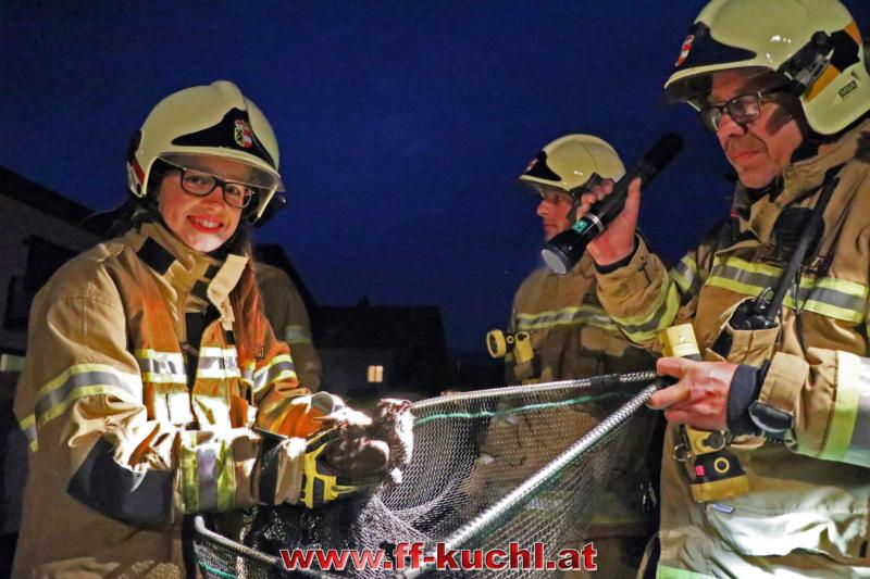 Über eine Leiter konnte der Raubvogel von den Mitgliedern der Bereitschaftsgruppe der FF Kuchl am Dach lokalisiert und anschließend mit einem großen Tierkescher eingefangen werden. Nach einer halben Stunde war die Tierrettung beendet.