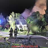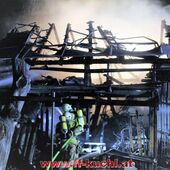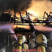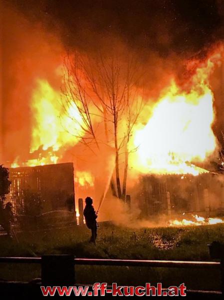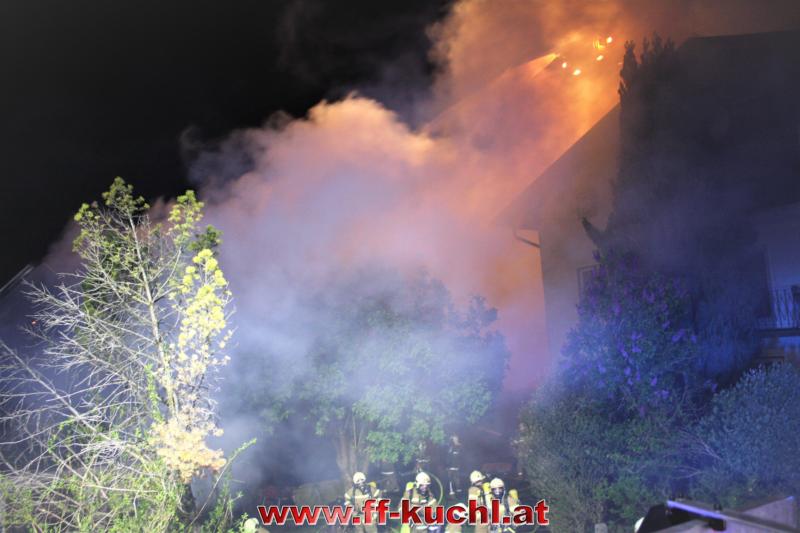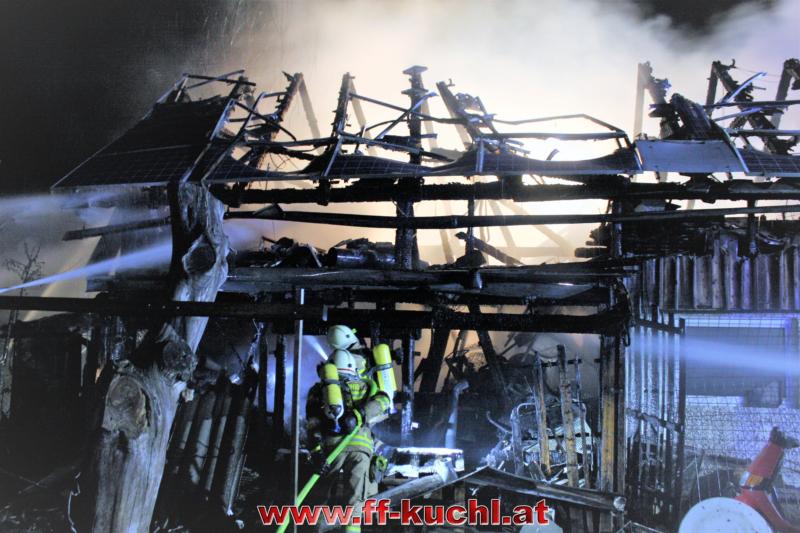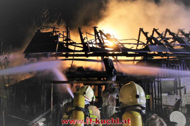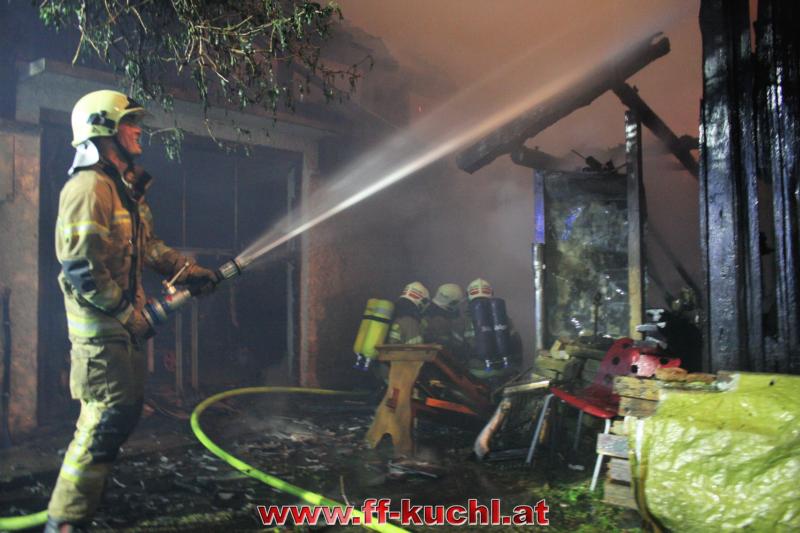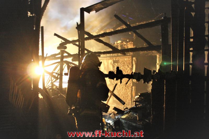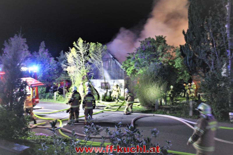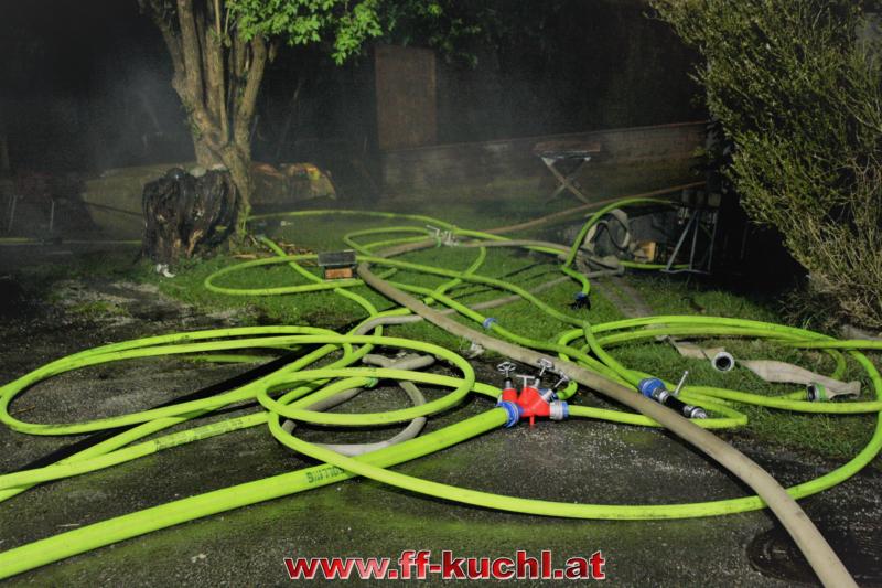 Die Mannschaft der FF Kuchl und LZ Jadorf, stellen die Wasserversorgung sicher. Atemschutztrupps wurden zur Brandbekämpfung eingesetzt.