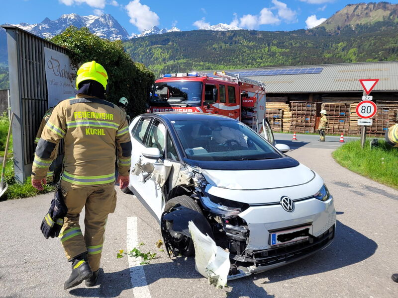 Ein Personenkraftwagen war gegen eine Lärmschutzmauer gefahren. Die FF Kuchl stellte den Brandschutz sicher und reinigte die Verkehrsflächen.