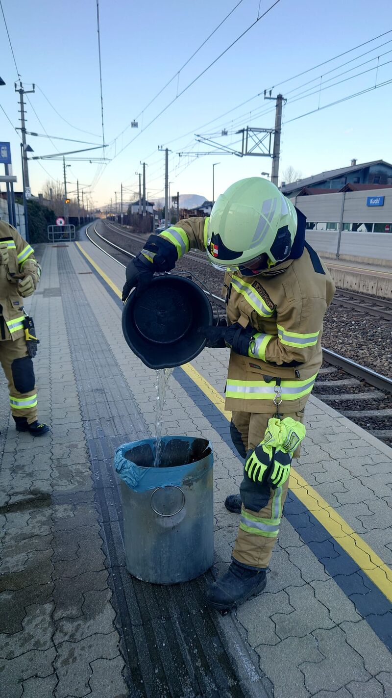 Die Feuerwehr Kuchl (Markt und LZ Jadorf) wurde am Freitag, den 08. März 2024 um 16:14 per Sirenenalarm zu einem Müllcontainer Brand am Bahnhof Kuchl alarmiert. Der Einsatzleiter konnte nach kurzer Erkundung an der Bahnhof Westseite im Bereich Bahnsteig (Wartehaus) einen Schwelbrand im Mülleimer feststellen. Die Besatzung des TLF löschte den Eimer ab und brachte den abgebrannten Inhalt zum Recyclinghof, um diesen auf etwaig entsorgte Akkus zu überprüfen. Der Einsatz konnte nach ca. einer Stunde wieder beendet werden und die Fahrzeuge in Feuerwehrhaus einrücken!