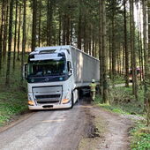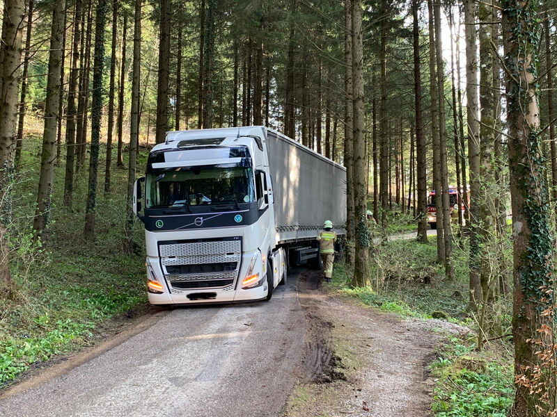 Aufgrund der Fahrzeuggröße und Fahrzeugwicht und der sehr schmalen Straße, konnte das Fahrzeug nicht mehr selbstständig die Fahrt fortsetzen.
