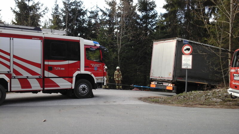 Die FF Kuchl verwendete die Seilwinde um den LKW wieder auf die normale Fahrbahn zu bringen.