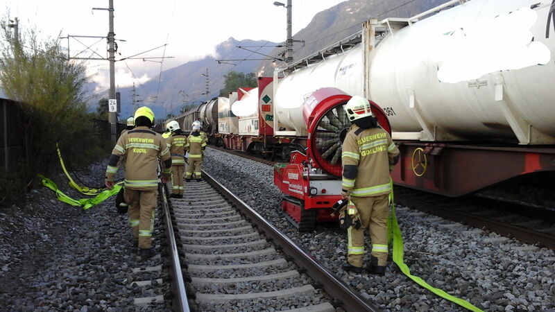 Der Einsatzleiter der Feuerwehr Kuchl ließ unverzüglich einen Atemschutztrupp zur Erkundung ausrüsten, das Gelände großräumig absperren, die Bahnstrecke sperren und den Gefahrgutzug Tennengau alarmieren.