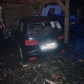 Alarmierung der FF Kuchl - Baum über Straße im Ortsteil Garnei. Ein Baum blockiert eine Straße und war auf ein Carport und einen PKW gestürtzt. Personen wurde keine verletzt.