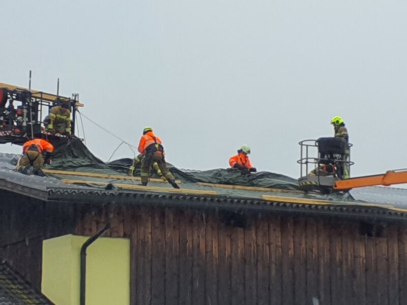 Die Einsatzkräfte dichteten das Dach mit Planen ab und konnten nach 3 Stunden wieder in das Feuerwehrhaus einrücken.