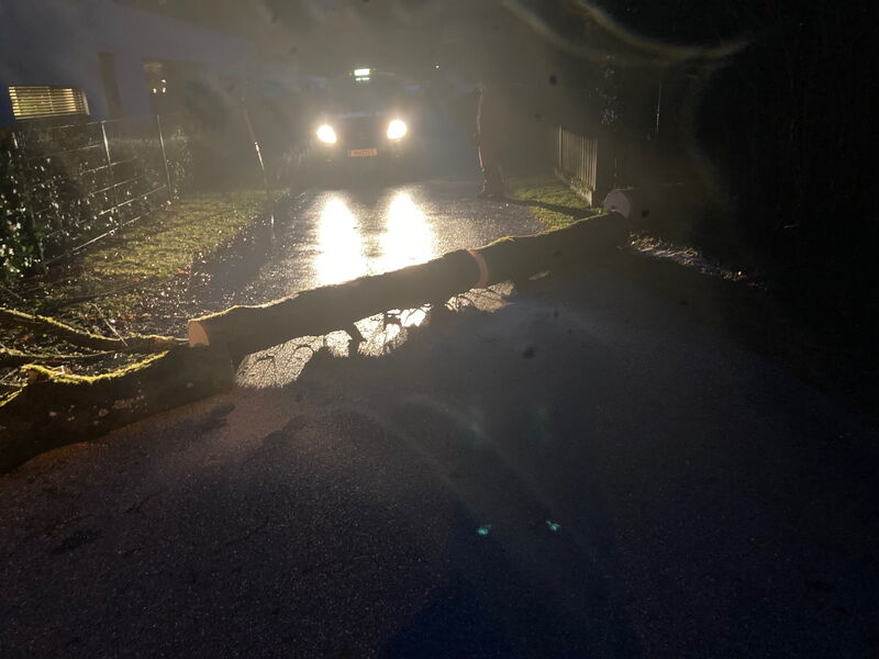 Alarmierung der FF Kuchl (3 Zug Markt), Unwettter / Sturm - Baum über Straße bei S-Bahn Garnei.