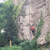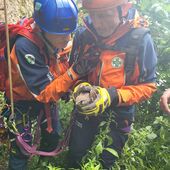 Ein Bergrettungsteam von 2 Personen seilte sich über die 60 Meter Felswand ab und befreite den Falken aus seiner Lage.