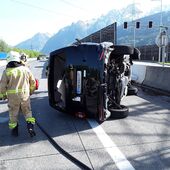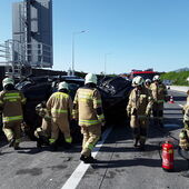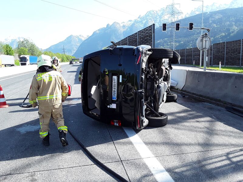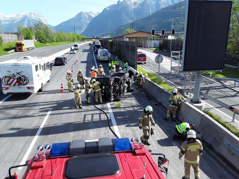 Beim Eintreffen der Einsatzkräfte stellte der Einsatzleiter fest, dass ein PKW nach der Kollision mit einem Aufpralldämpfer auf der Seite zum Liegen kam. Die verletzte Person wurde bereits durch das Rote Kreuz versorgt. Die Einsatzkräfte übernahmen die Verkehrsabsicherung und stellten den Brandschutz sicher.