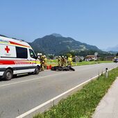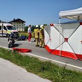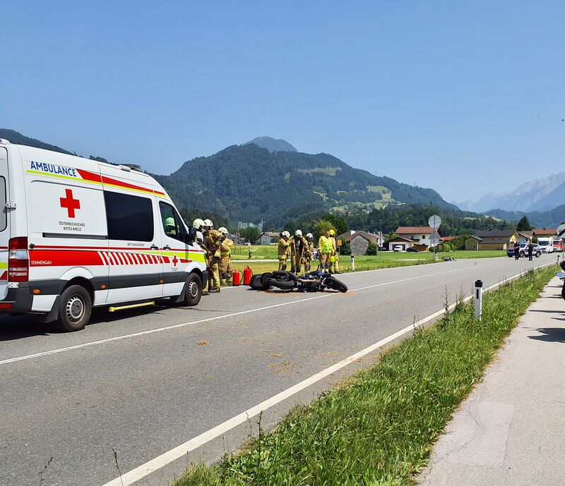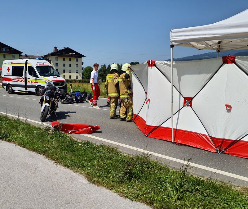 In Fahrtrichtung Kuchl kam es zu einer Kollision zwischen einem Motorradfahrer und einer Fahrradfahrerin. Die Feuerwehr sicherte die Unfallstelle ab, errichtete einen Sichtschutz und unterstützte den Rettungsdienst bei der Versorgung der verletzten Personen.